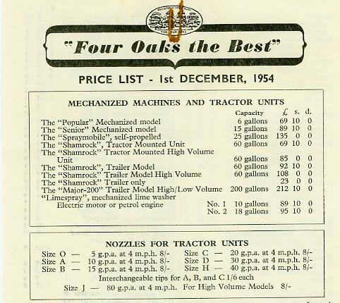 will-haggleParticipantI’m showing my Four Oaks Spraymobile with some other sprayers this year and I’ve been looking through my litarature, kindly supplied to me by Sprayerman, when I came across a 1954 price list. it lists the 25 gallon Spraymobile at £135! I was surprised to find it listed in 1954, because in 50 Years of Garden Machinery it says “The pedestrian-controlled Spraymobile, introduced in 1960 had everything except a seat.” I had an idea mine was earlier than 1960 because of the Villiers Mk12 engine. I will now take the starting pulley off and check the date. Some re-writing of information sheets may be required!