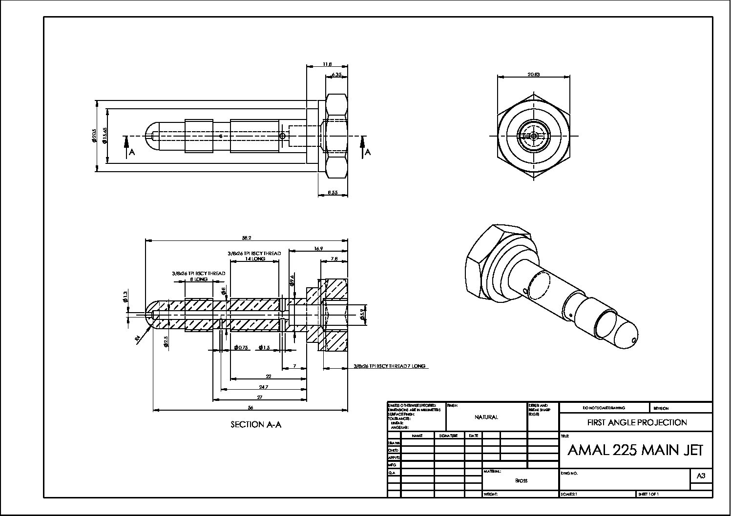 vhgmcbuddyMemberI have a Douglas SV54 engine fitted with the same model carb, so have pulled the main jet out and produced the attached drawing. I also have a Trusty with Norton Big 4 engine and Amal 225 carb. The main jet is identical to that in the Douglas carb apart from the spanner hex on the Douglas carb is 7/16″ Whitworth, where the Norton is 3/8″ Whitworth.