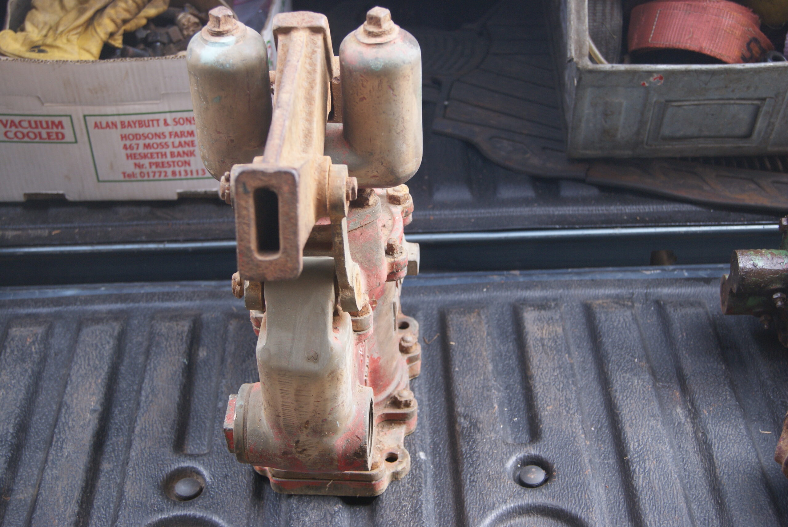 There are two slots on the top where two handles fit in and it has holes in the base to bolt it down to something. Would the red paint indicate Fire Brigade I wonder, or could it be a bilge pump off a boat??