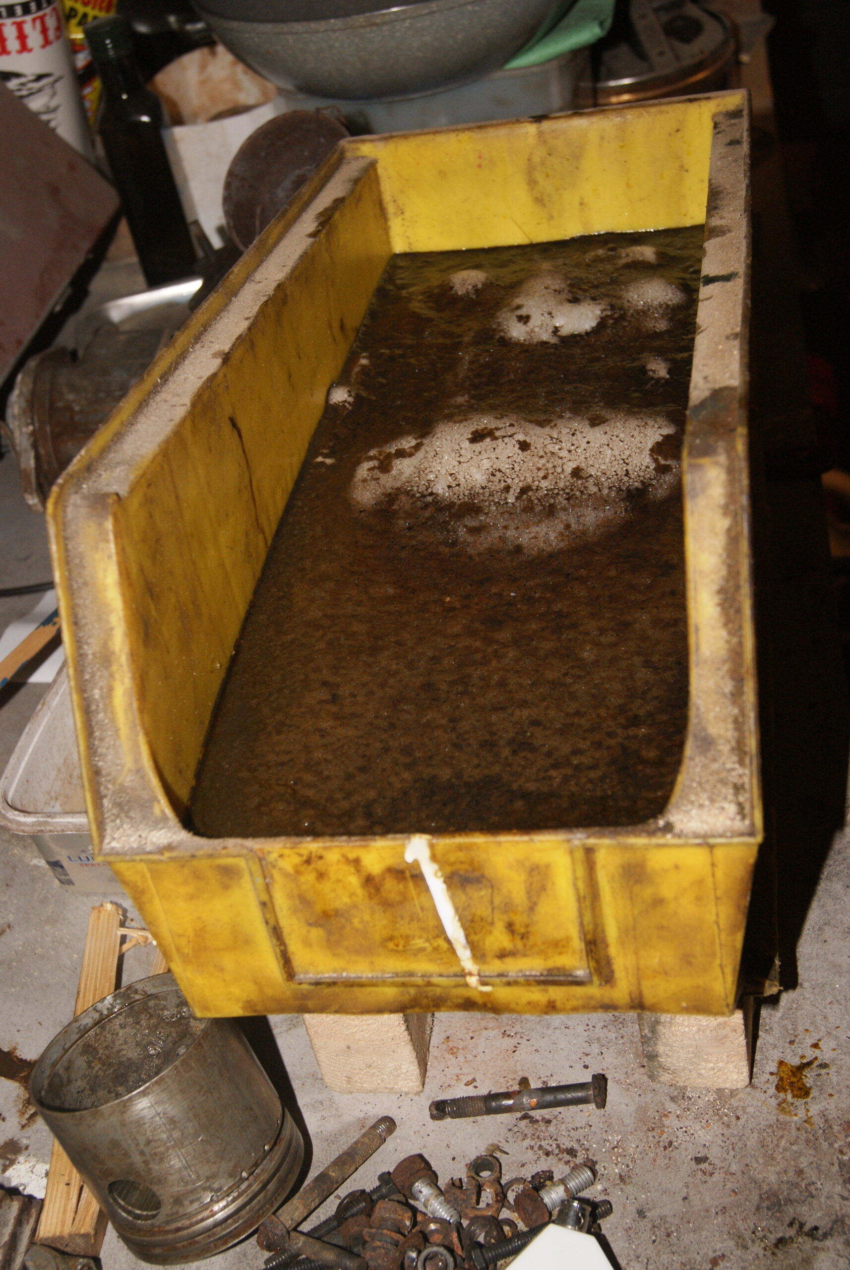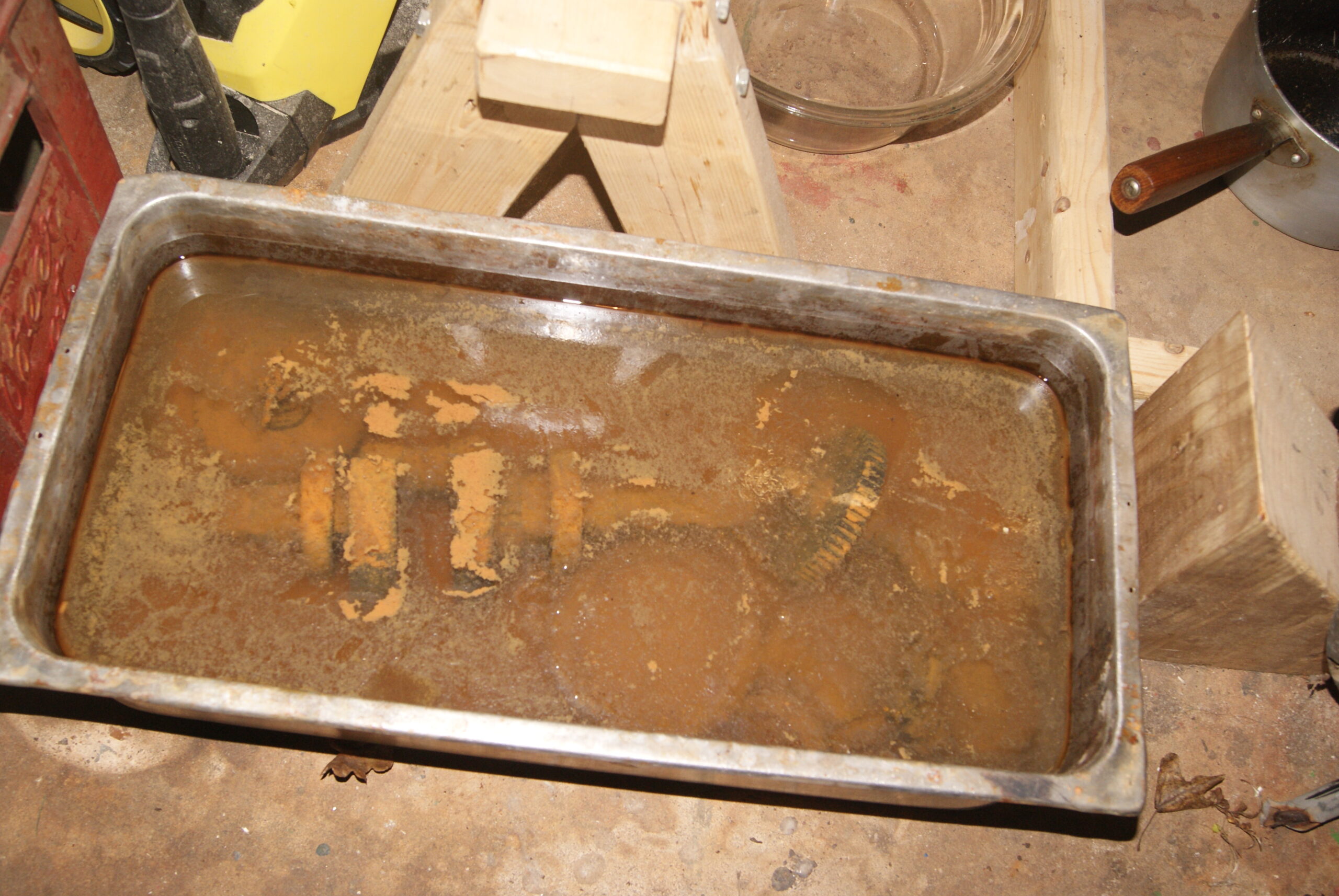 trusty220KeymasterI use the Brick and Patio Cleaner that Jewsons sell. It’s quite a dilute Sulphuric Acid and so it is kinder on the metal than some others. Either way it seems to work well enough but you need to do the soaking in a well-ventilated place because it will give off Hydrogen Sulphide (H2S) which can be harmful (and flammable) if allowed to build up. The missus can be a problem as well because she objects to the smell!