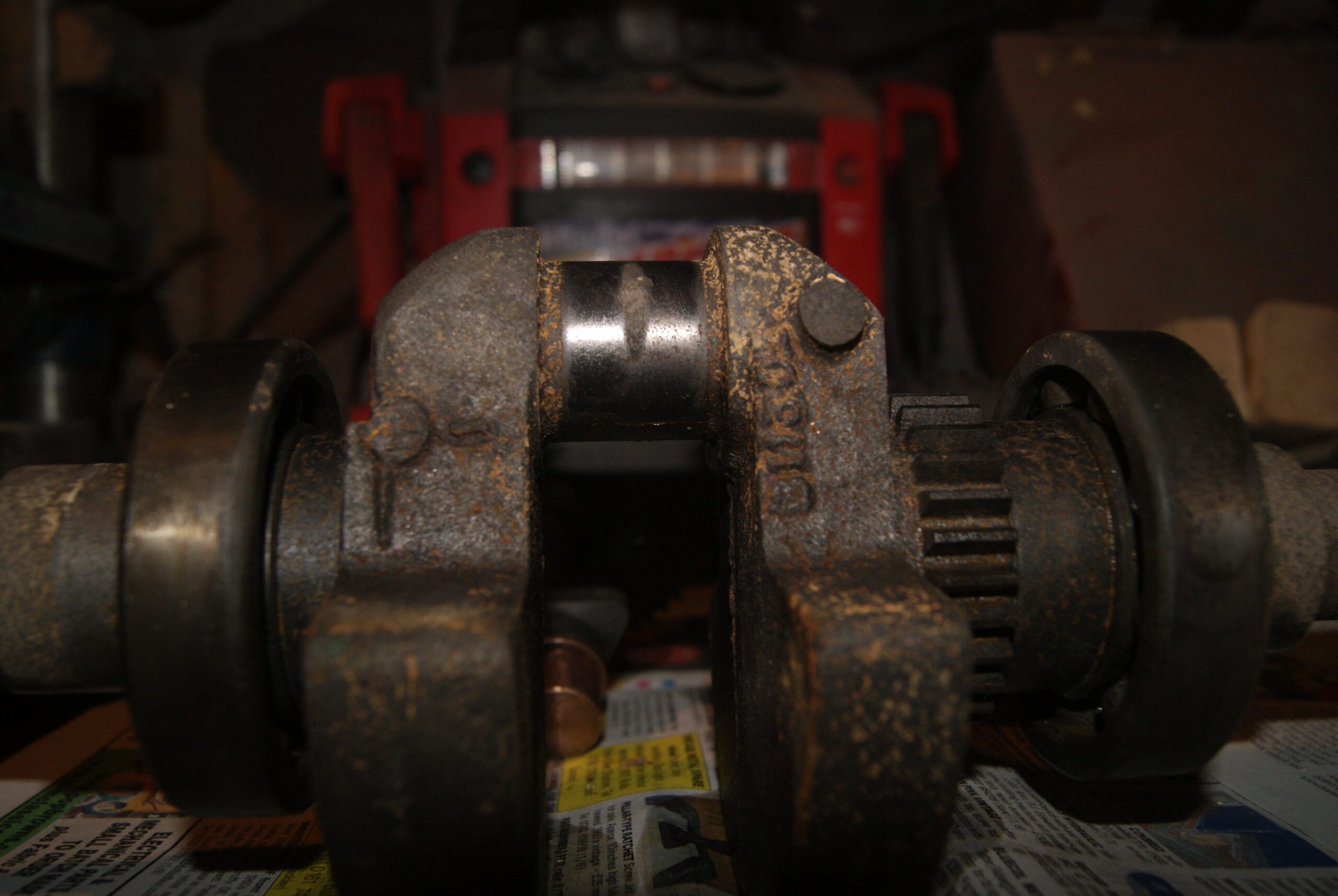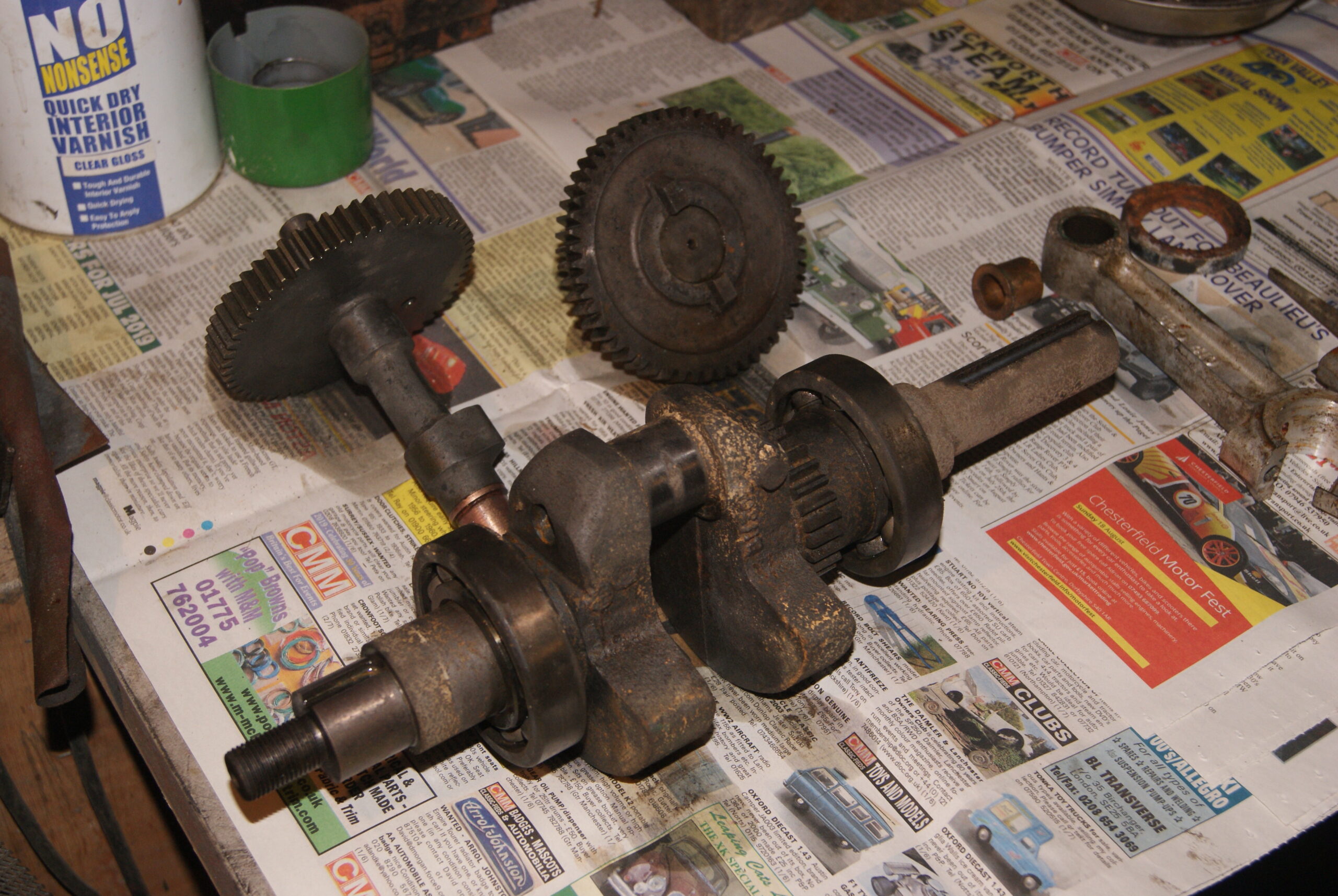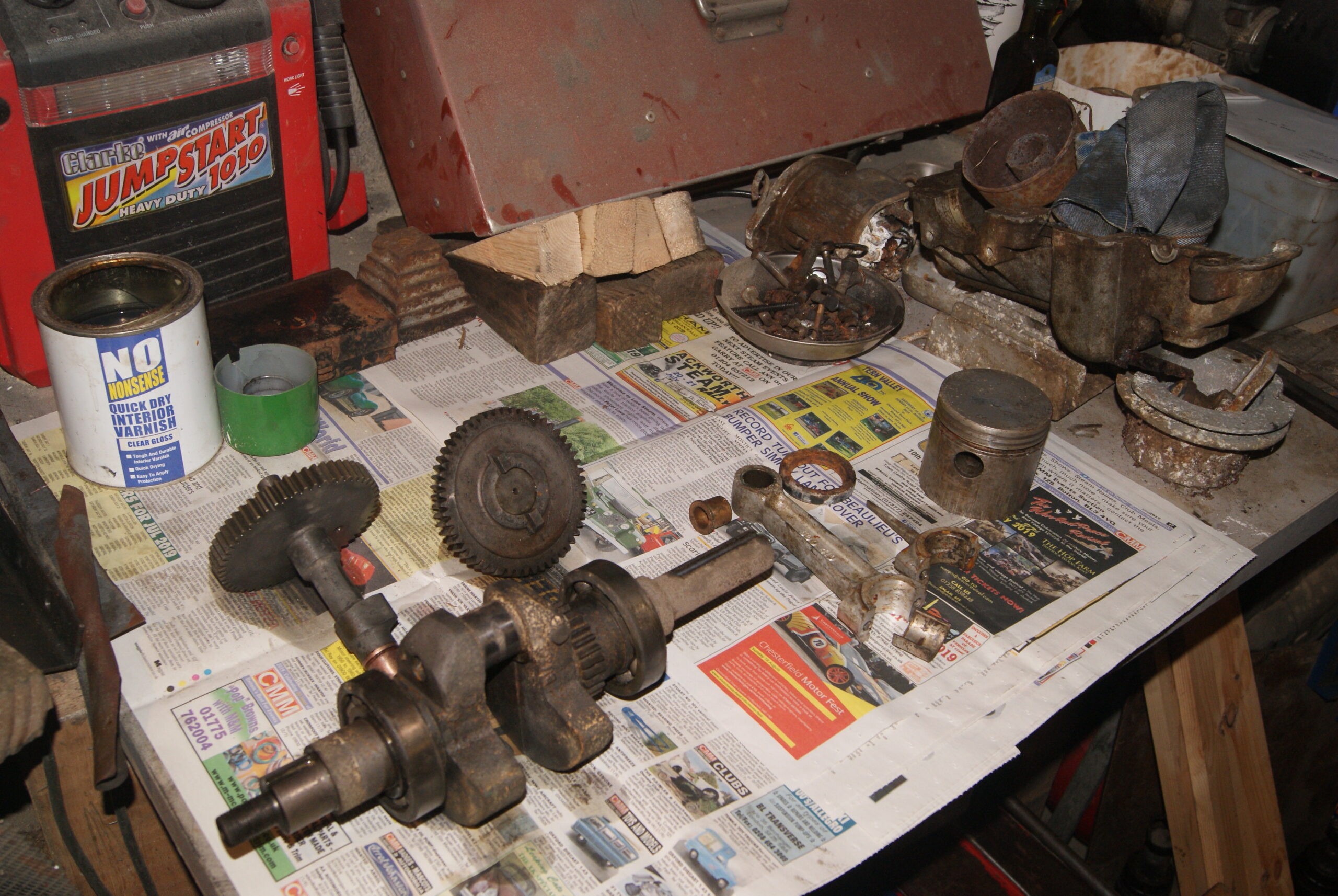 trusty220KeymasterI’ve been a little busy over the last few days, but here are a few pictures just to keep your interest alive. The crankshaft, camshaft and intermediate magneto drive gear went into the acid bath for a clean up; they are now getting a bath in bicarbonate to neutralise the acid and looking very good already. The barrel still has it’s valves in- both are stuck fast in their guides, so a long soak in the acid will be the order of the day to try to free them up as gently as possible. You can see the effect of the acid bath in the one photo as there is a build up of froth from the reaction with great big flakes of rust floating on the top- I really hope there is something left when I pick it up again!
