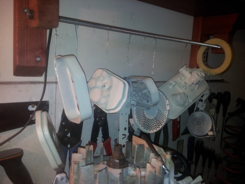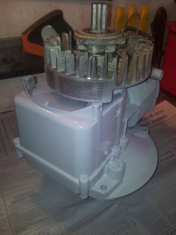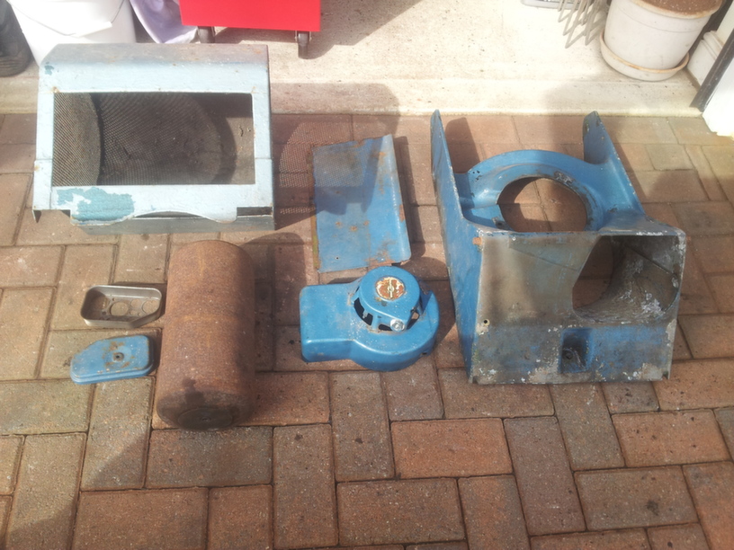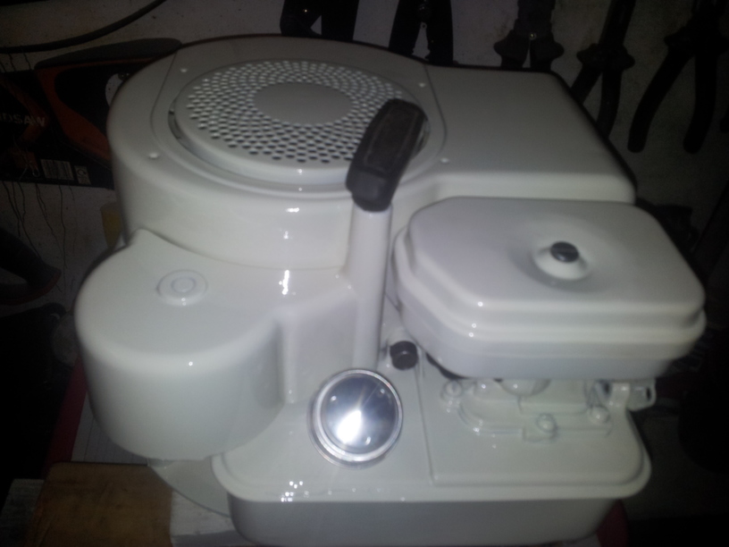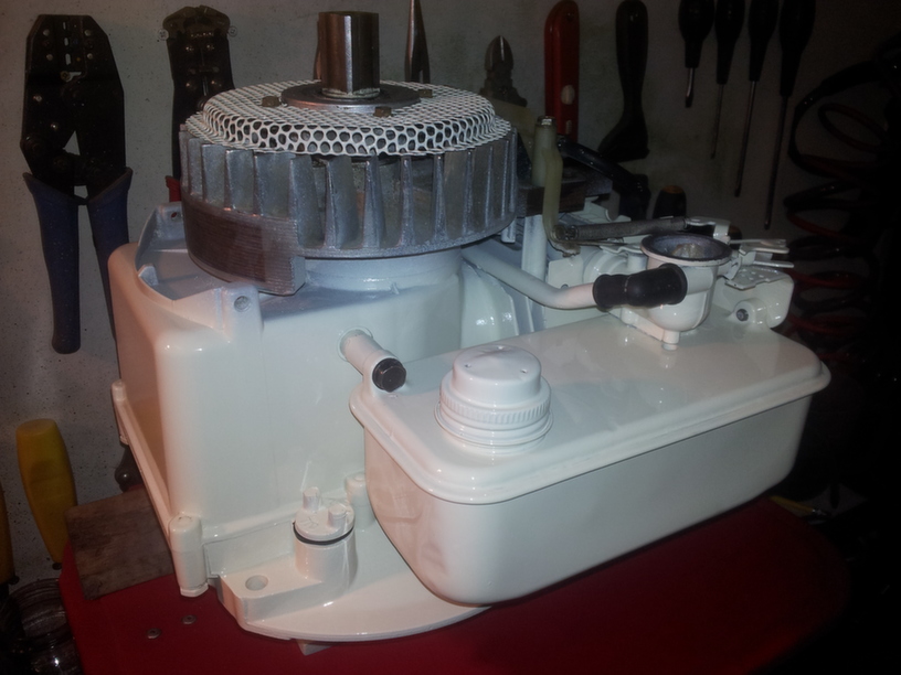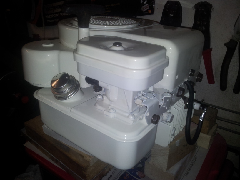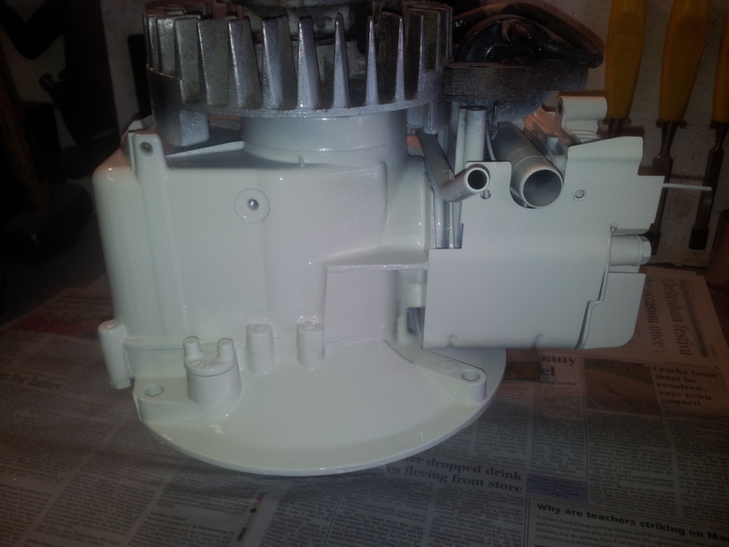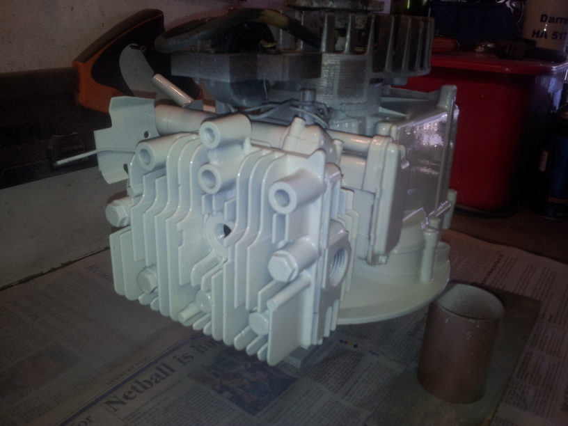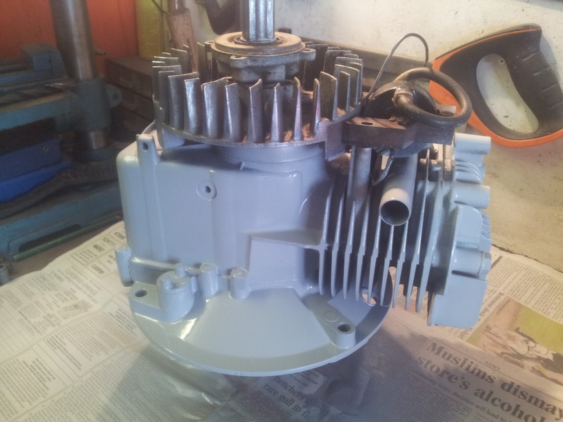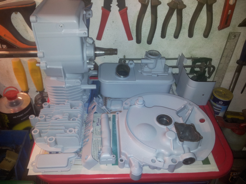 I removed all the old paint on the engine using a heavy duty paint stripper, etch primed and applied several coats of matched colour. The tank, carb, bracket etc also had the same treatment.