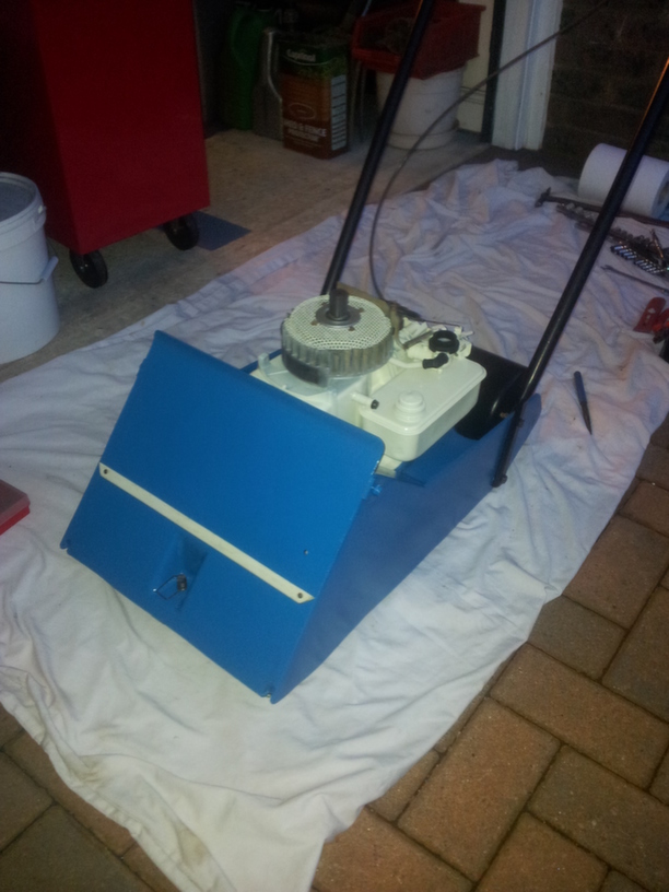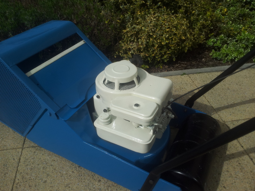 I also painted the engine shroud and metal air filter tins in the white, as was original to the machine. The handlebars, roller and blade guard were powder coated satin black.April 12, 2014 at 9:34 am #7372