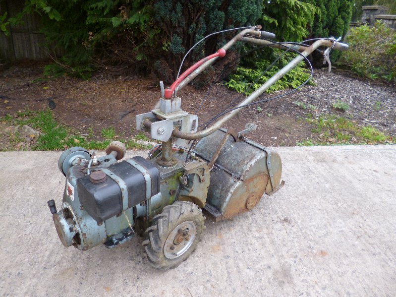 Latest addition to my Monrotiller collection is a series MG3 machine. This was an updated version of the series 3 produced by Mechanised Gardening. Main differences are the handle bar arrangement and the Clinton engine. The machine is at present a non runner, no spark.
