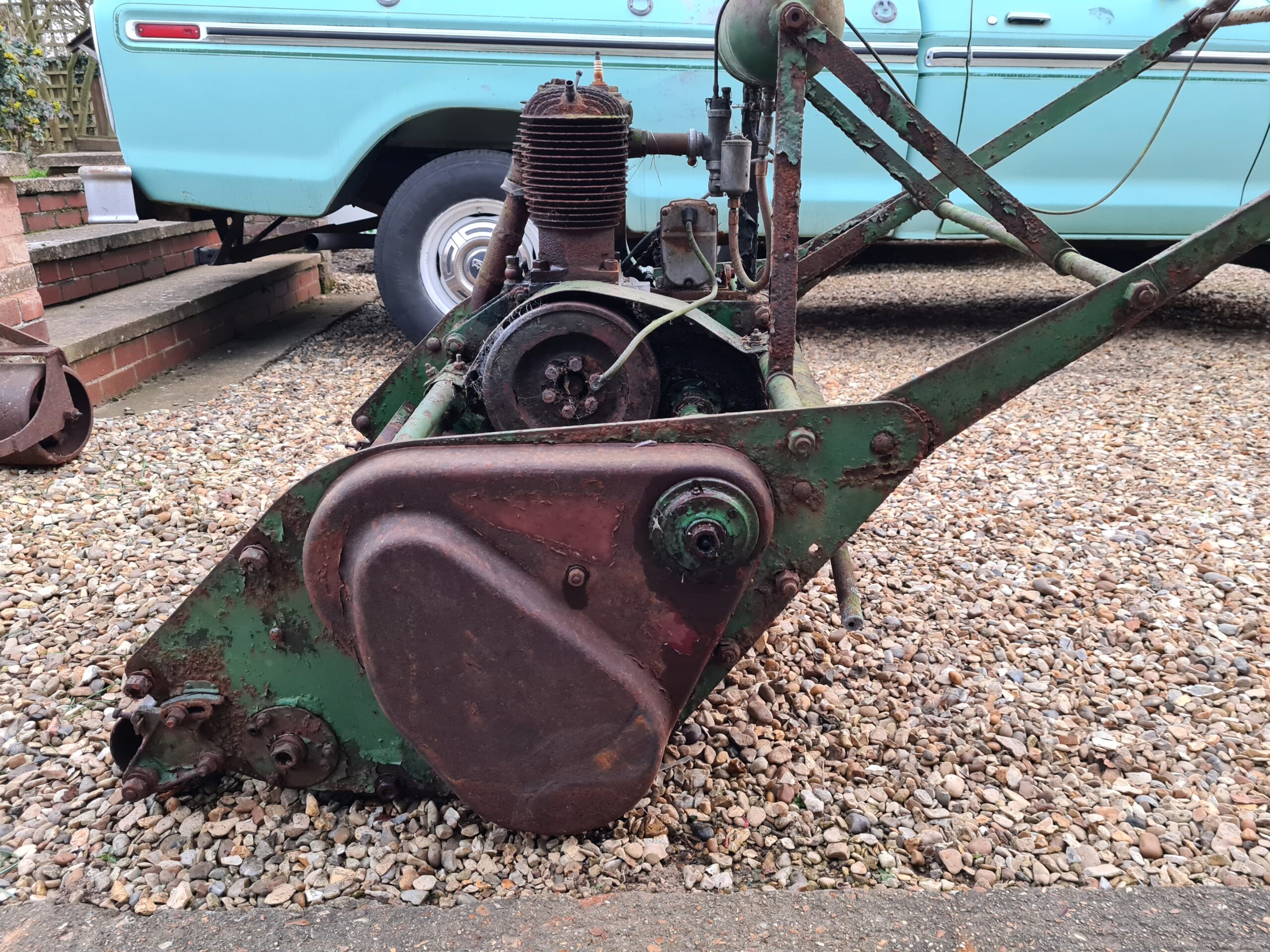 I’ve attached some pictures of a mower a got today. I can’t see any kind of ID plate on it or make. It’s a 30 inch roller, unbelievably heavy and also gas a sit on roller. I’ve been through a lot of Google images but can’t see anything like it.