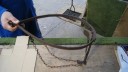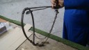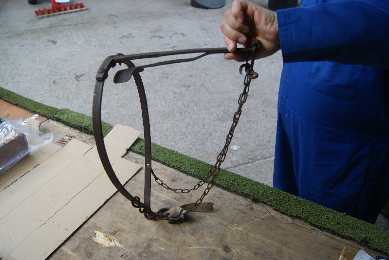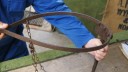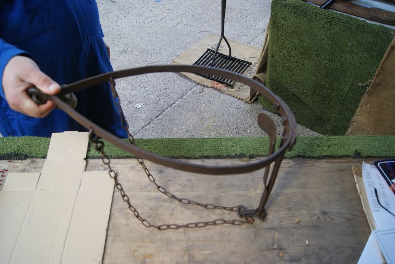 The general opinion is that it is a home-made device for weaning calves and would fit around a calf’s neck like a collar. The weight of it would be taken on the spoon-like device until it raised it’s head to feed from mother’s udder; this would then overcome the spring tension in the spoon and bring the three short spikes into contact with the top of the calf’s neck, discouraging it from feeding.