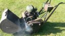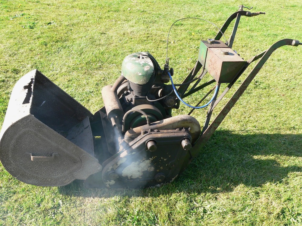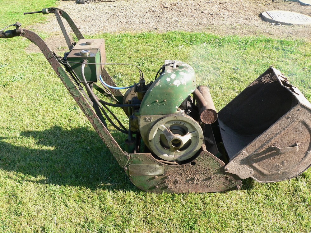 I brought this home today and after about 4hours got it to run, the build quality is extremely good and engineered to last. The engine was free but no compression so took the head off and remarkably no rust and valves were free. its got the Wipack with the impulse mag, cleaned the points and got a poor intermittent spark, points were set at 30-40 thou so no wonder. Carburettor was missing the nut that holds the slid down but it would stop it running. took a little time to bodge up the pipe from tank to carb and so had a good try to get some response with no luck so rigged up a claw like the starting handle had to enable to use and electric drill. it worked and not surprising it standing for years the sump was full of oil so smoked just a bit. Very quirt and had a go at engaging the cylinder dog clutch, froze solid so stripped and heated with a bearing puller got it shifted, this soon shifted heaps of rust and really the only bad corrosion as must have stood on a wet earth floor as a few blades are almost gone but still got some grass in its box. Its got a bit of piston slap and ether rings are stuck or someone been and broke them as still little or no compression. I guess its quite late with the type of mag used so arround late 30s early 40s?. So needs a engine investigation with a few bits making, Cylinder and bottom blade repair then would go for years. Anyone know the engine make. and year of build.