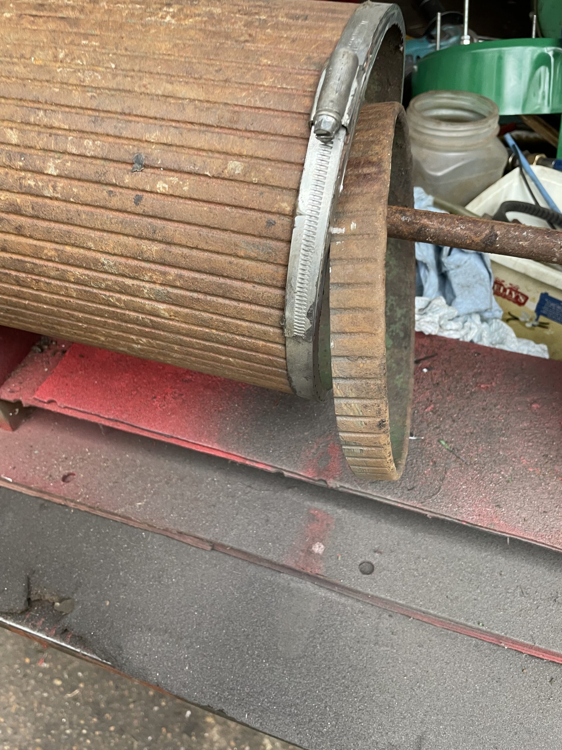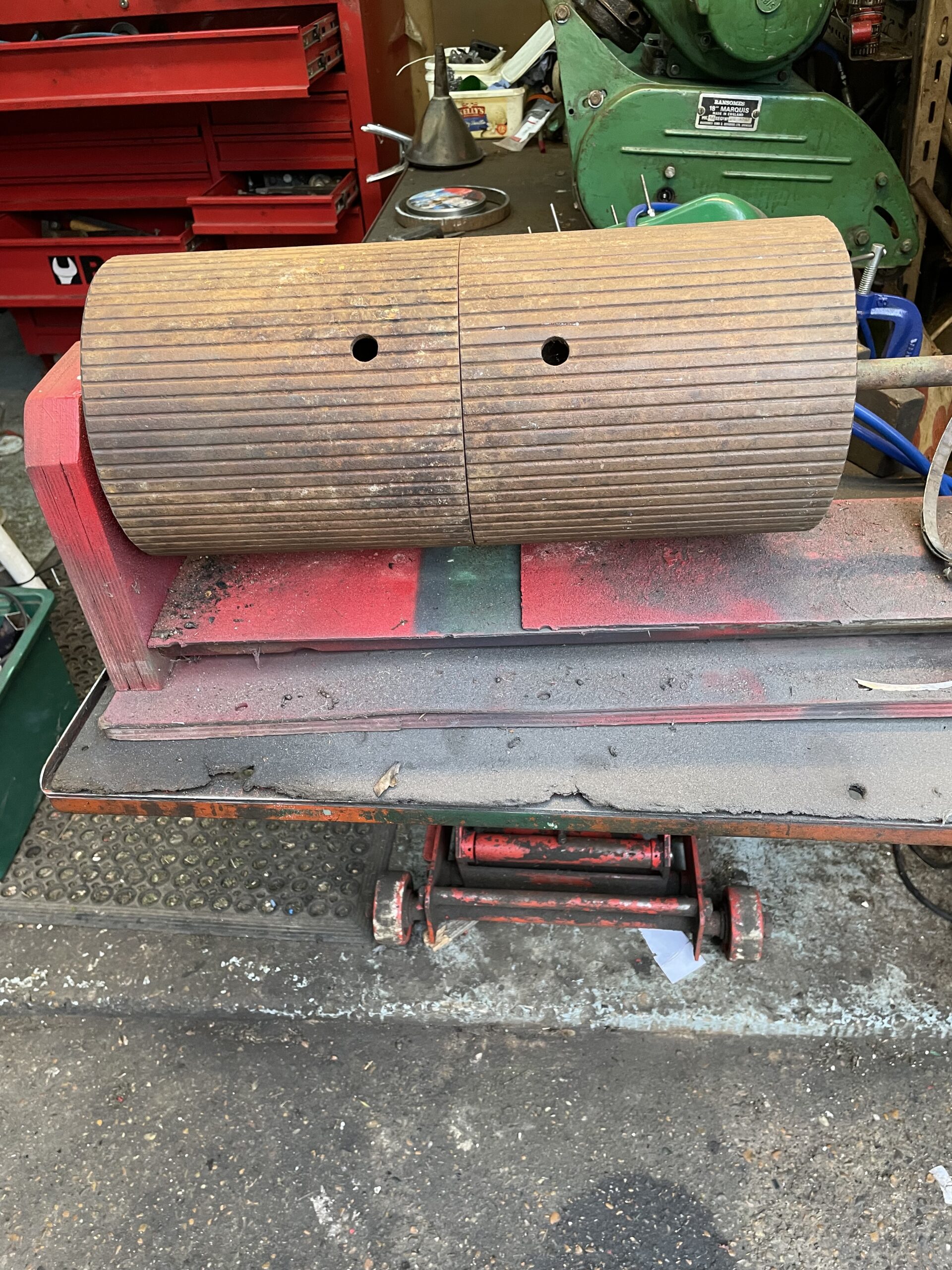 Rear roller rusted, cracked and wasted away. No roller drums for the 18” in my stock of salvaged parts and none of my usual sources could help.