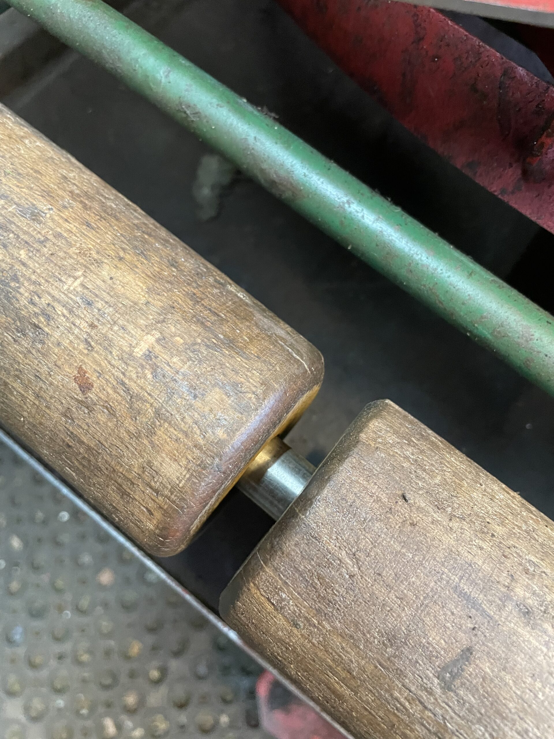Both were undercover but the 18” appeared to have been standing in a swamp – front rollers rotted away and their shaft oval and wasted. Stainless steel pipe over the oval shaft and rollers from the odds collection fixed that.