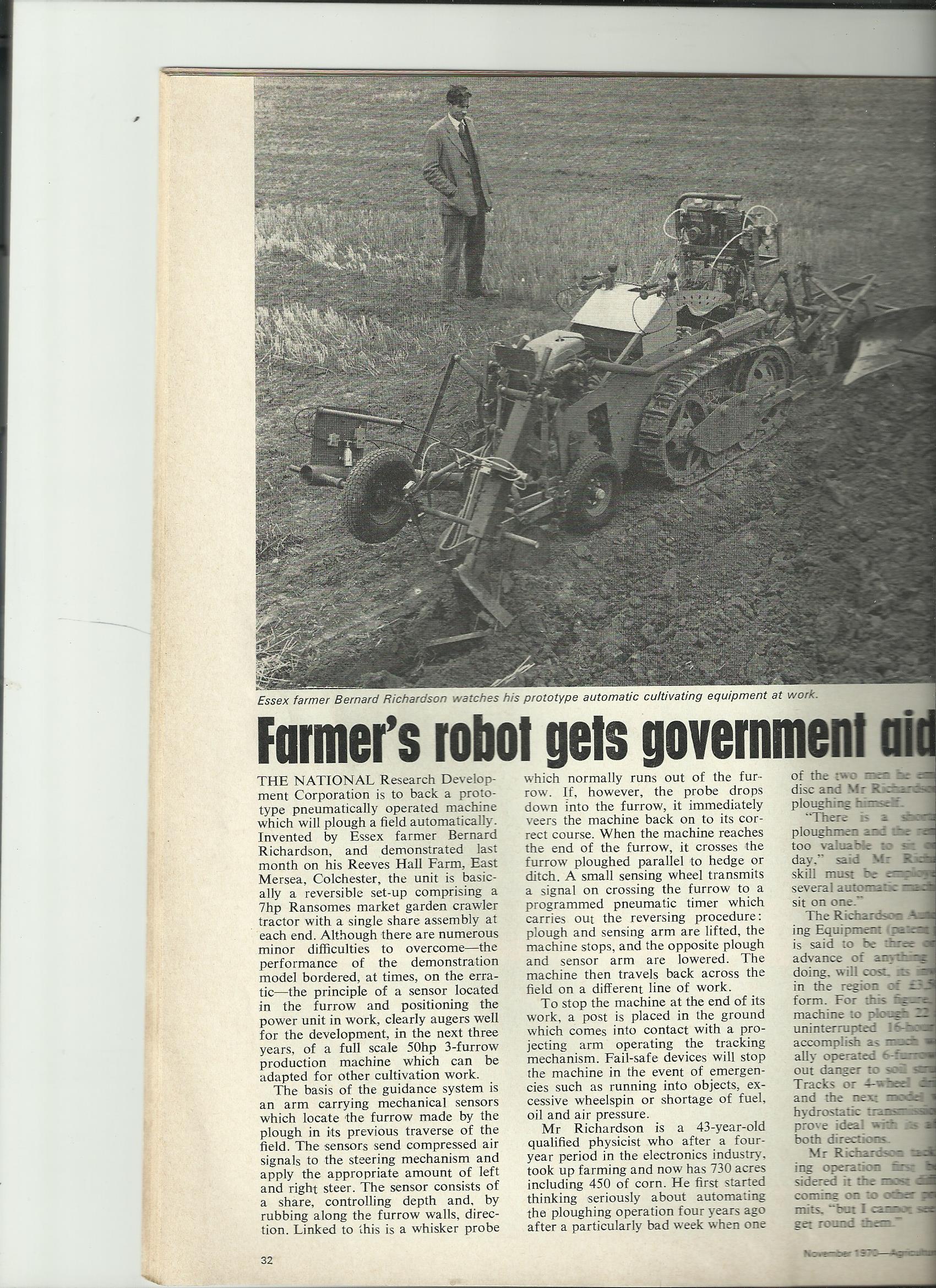 I wonder did it survive ? Mr Richardson would now be 90 so is probably not around but would it qualify for a vintage horticultural ploughing match ?? probably too late a model. Probably my sense of the ridiculous but a vision of sensor malfunction and it heading off across adjacent plots and resulting mayhem raise a smile. I suppose without driver insurance cover would not be available for public operation.
