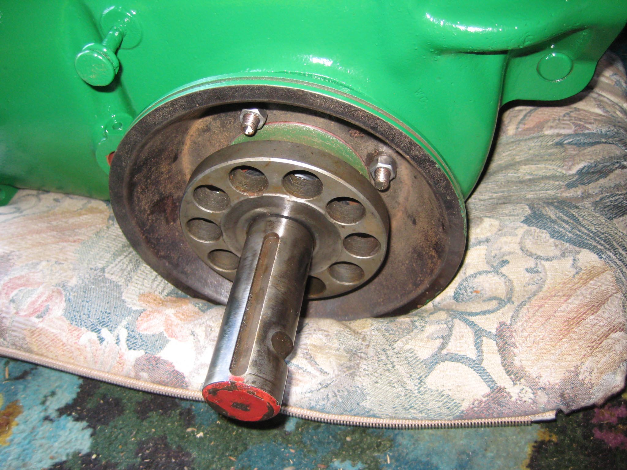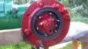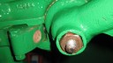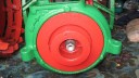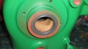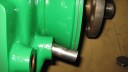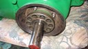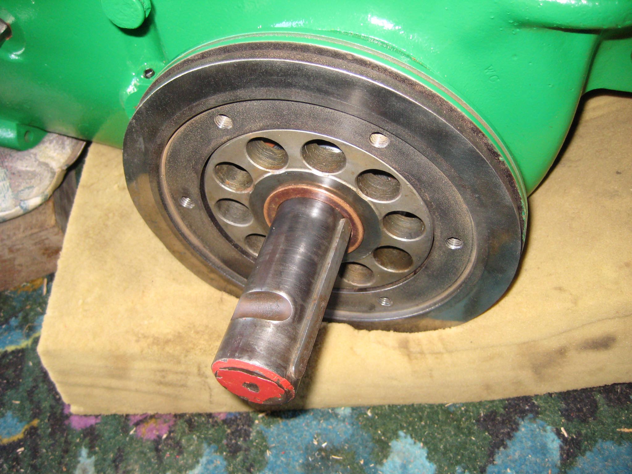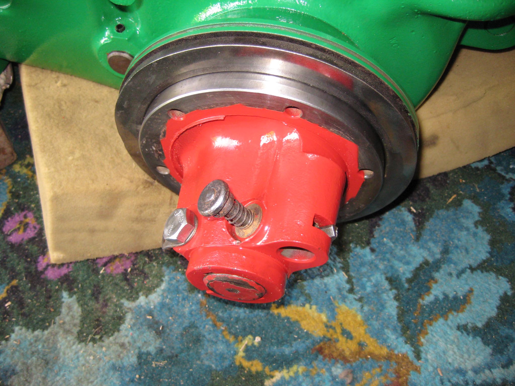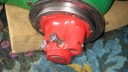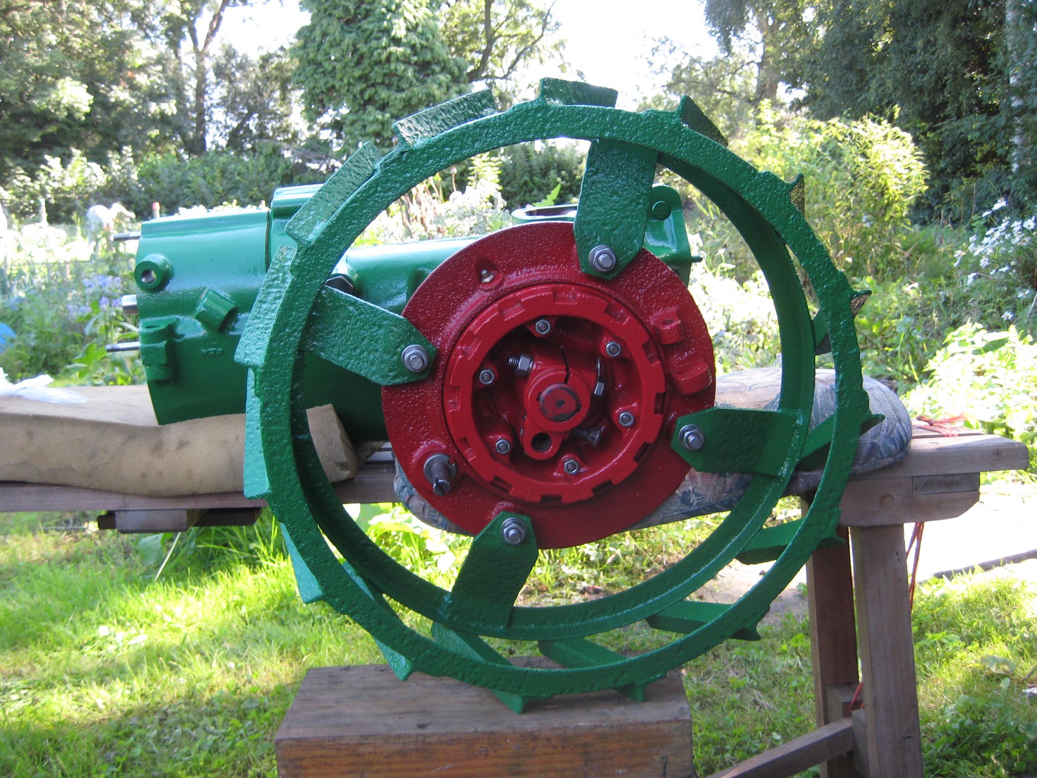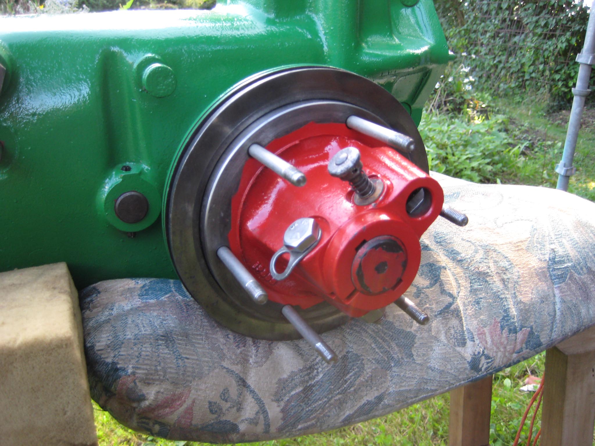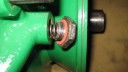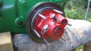 I decided that I would next fit the wheels, simply to make the machine easier to move around, as it now needs at least two people to lift it. Six M8 threaded studs are screwed into the wheel flanges (Simar 0044). The pivot pin for the Red pawl was fitted to the road wheel discs. This locates onto a 6mm peg that prevents the pin from spinning around when you tighten up the M14 fine thread nut on the back (Simar 0045). The Red pawl and Green lock will be fitted at a later date. The wheel discs where slid into place over the bowl shaped extensions on the side of the gearbox (Simar 0046). The castellated casting fits onto the six studs. The four M12 studs which mount the wheels were then screwed into the wheel discs, along with a M10 x 1.0 grease nipple (Simar 0047). Final job for the day was to fit the wheels (Simar 0048).