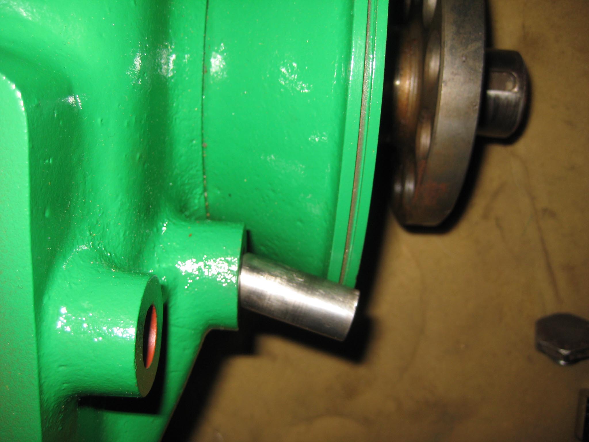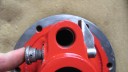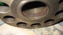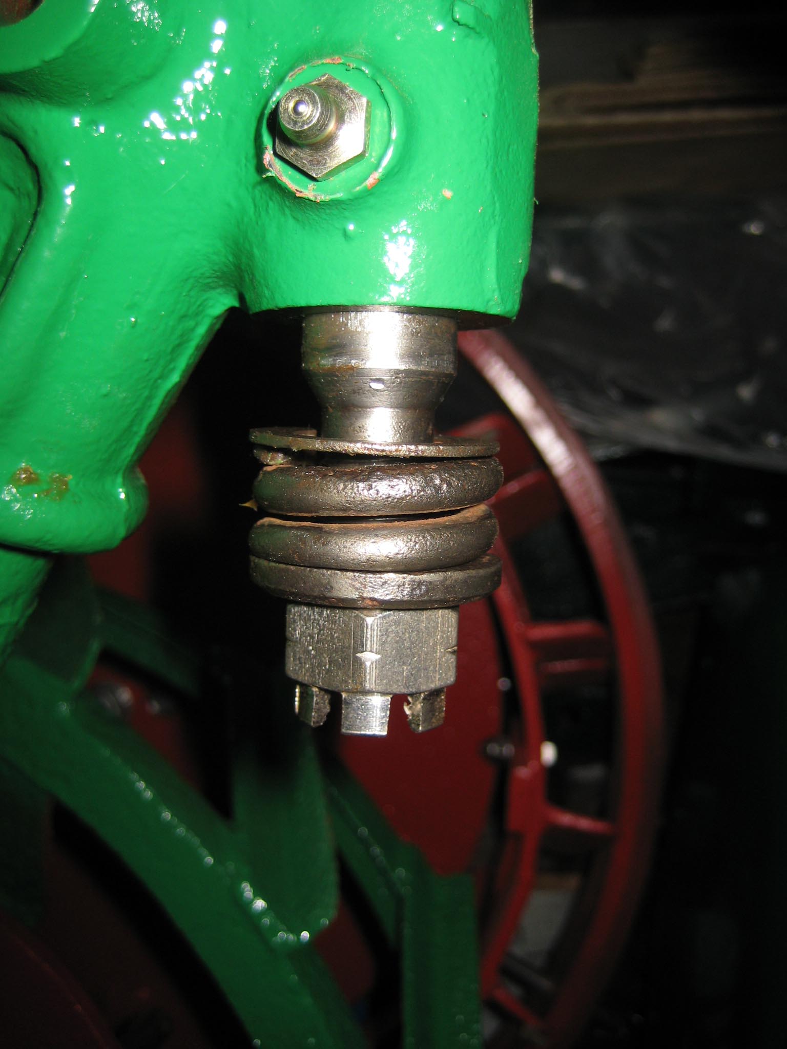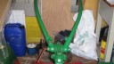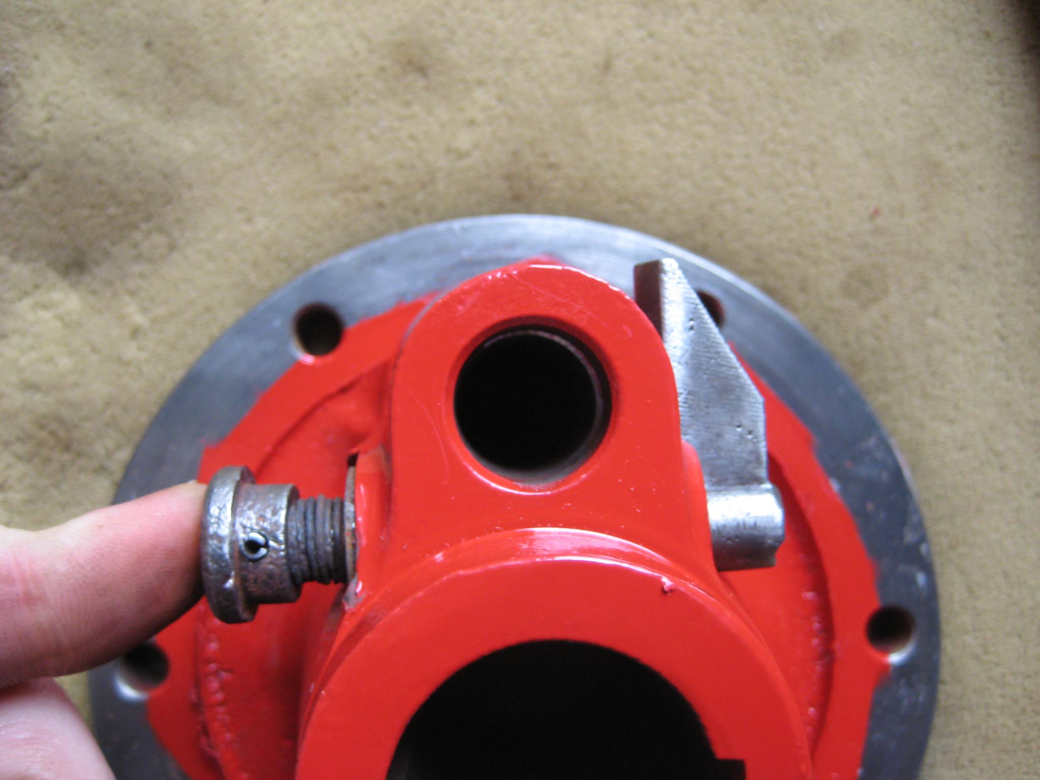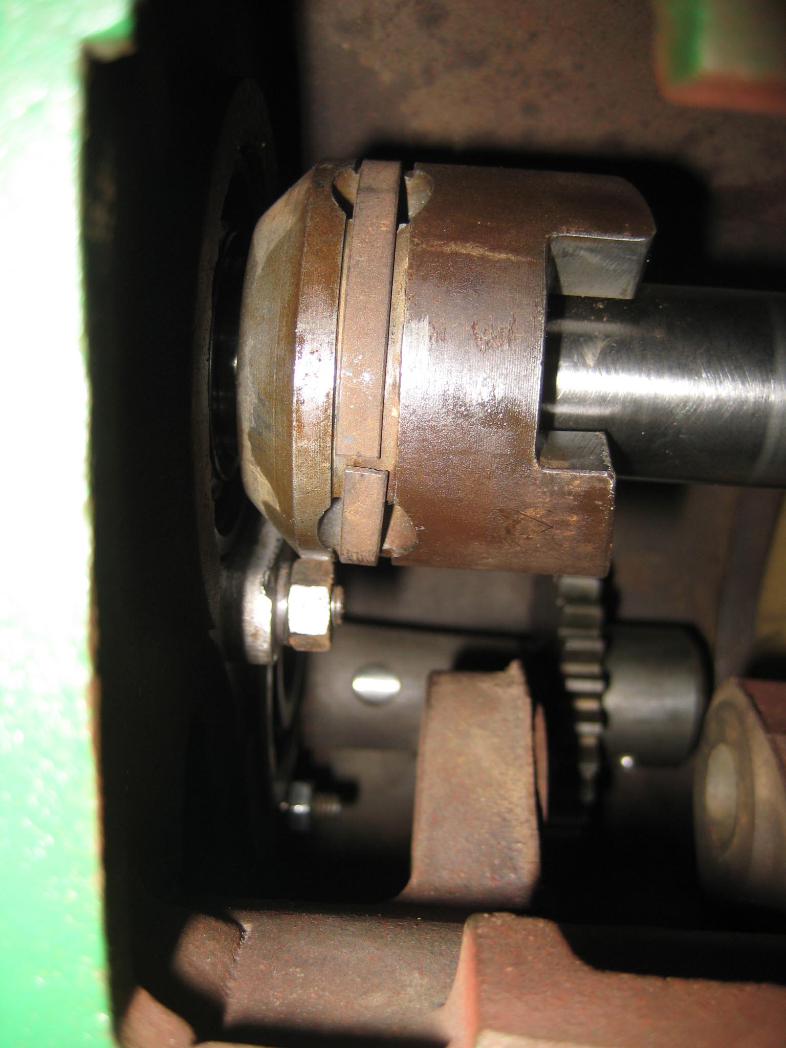 I decided that I would next fit the wheels, simply to make the machine easier to move around, as it now needs at least two people to lift it. Six M8 threaded studs are screwed into the wheel flanges (Simar 0044). The pivot pin for the Red pawl was fitted to the road wheel discs. This locates onto a 6mm peg that prevents the pin from spinning around when you tighten up the M14 fine thread nut on the back (Simar 0045). The Red pawl and Green lock will be fitted at a later date. The wheel discs where slid into place over the bowl shaped extensions on the side of the gearbox (Simar 0046). The castellated casting fits onto the six studs. The four M12 studs which mount the wheels were then screwed into the wheel discs, along with a M10 x 1.0 grease nipple (Simar 0047). Final job for the day was to fit the wheels (Simar 0048).