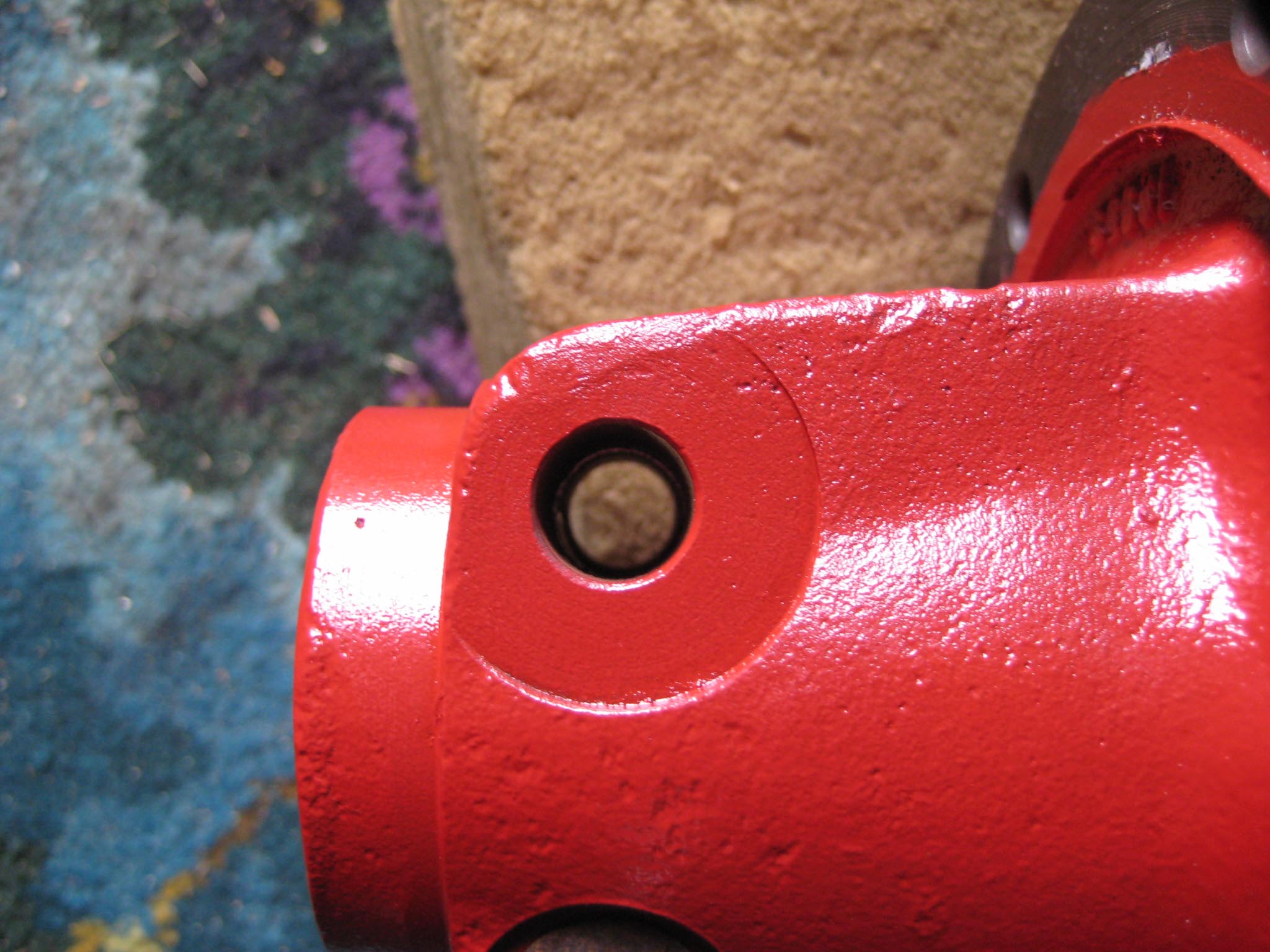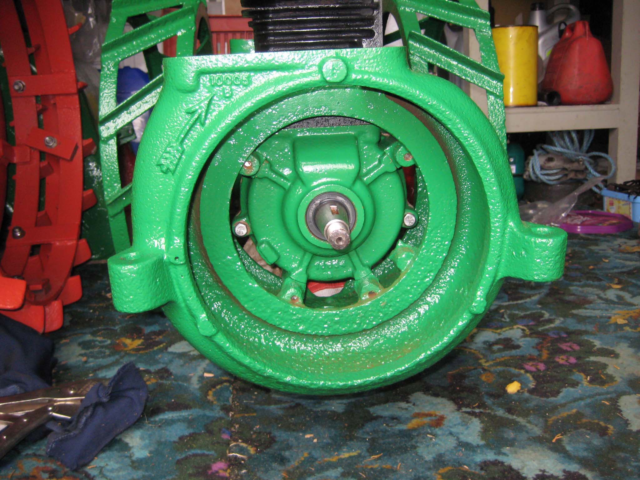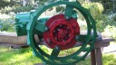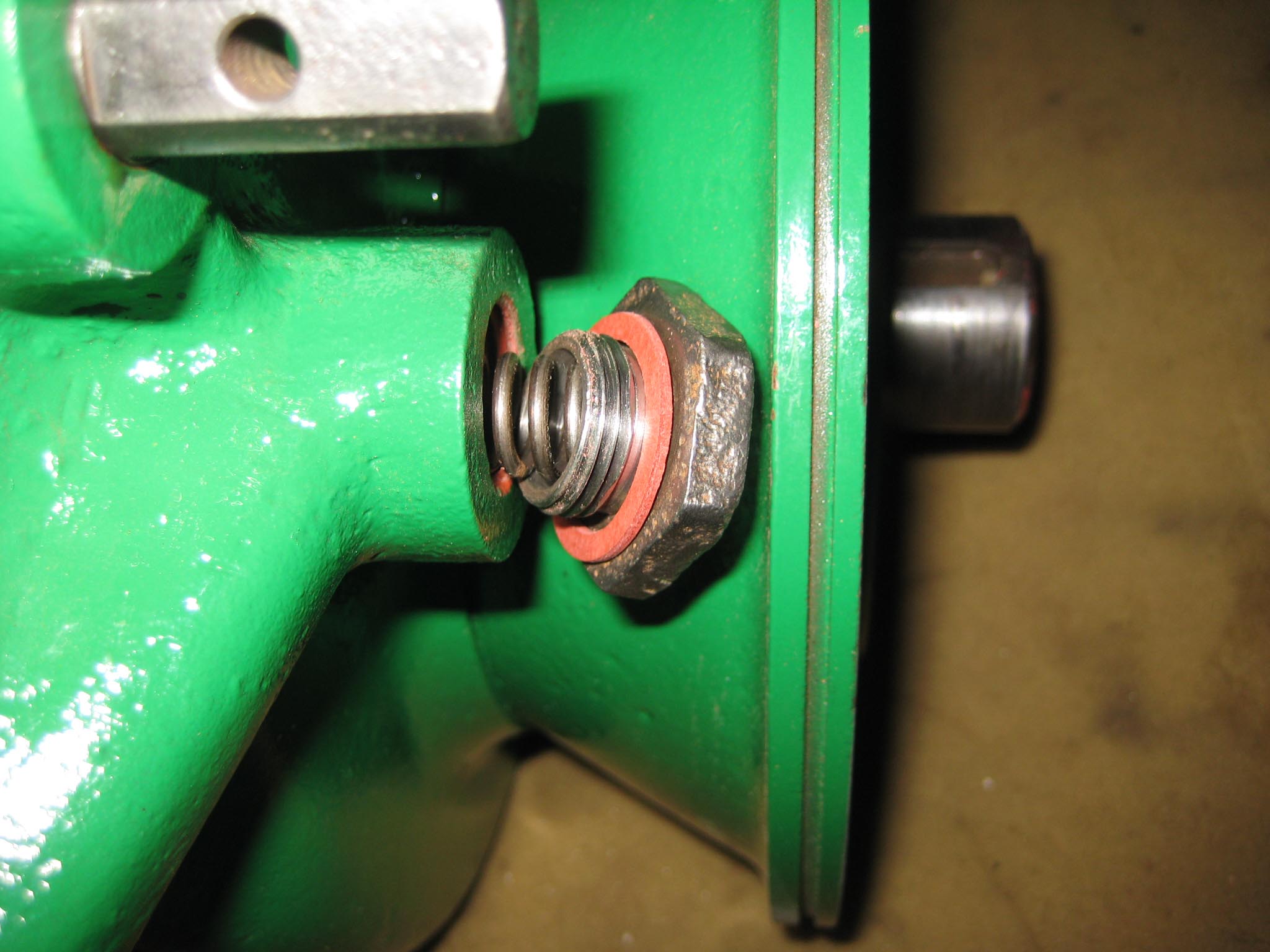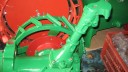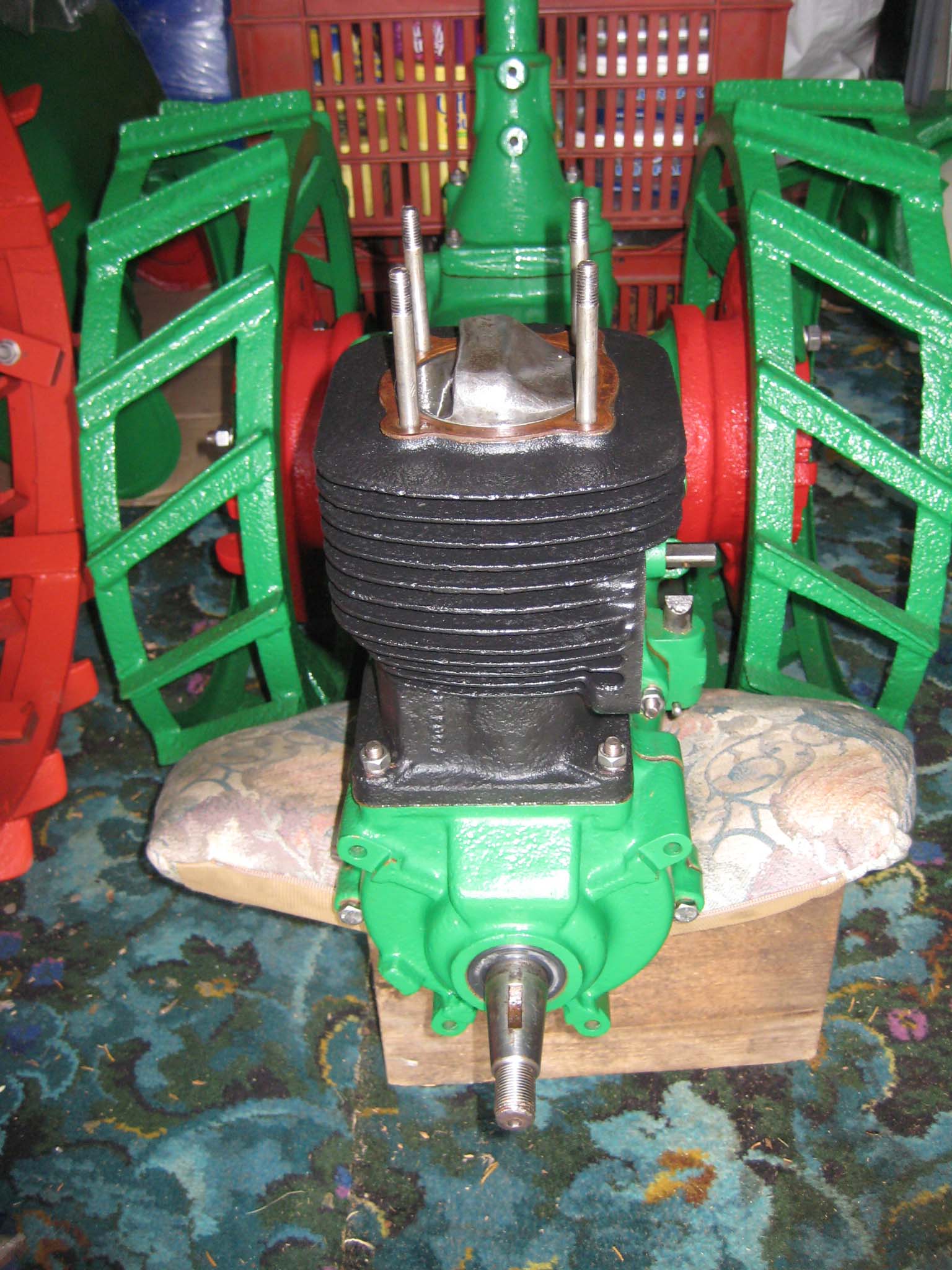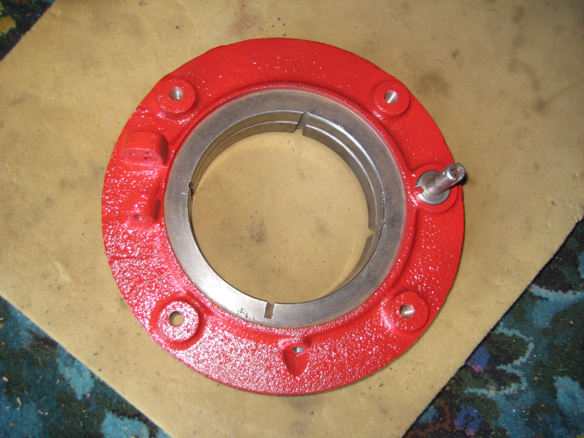 I decided that I would next fit the wheels, simply to make the machine easier to move around, as it now needs at least two people to lift it. Six M8 threaded studs are screwed into the wheel flanges (Simar 0044). The pivot pin for the Red pawl was fitted to the road wheel discs. This locates onto a 6mm peg that prevents the pin from spinning around when you tighten up the M14 fine thread nut on the back (Simar 0045). The Red pawl and Green lock will be fitted at a later date. The wheel discs where slid into place over the bowl shaped extensions on the side of the gearbox (Simar 0046). The castellated casting fits onto the six studs. The four M12 studs which mount the wheels were then screwed into the wheel discs, along with a M10 x 1.0 grease nipple (Simar 0047). Final job for the day was to fit the wheels (Simar 0048).