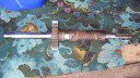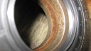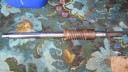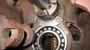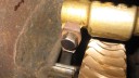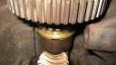 The cooling fan casing was prepared by installing the four M8 mounting studs (Simar 0073) and then fitted to the crankcase (Simar 0074). The cooling fan fits on the tapered crankshaft via a half moon key. A M18 x 1.5 nut holds the fan in place. The original nut was too corroded for reuse, so a replacement was obtained in the form of a wheel nut from a piece of agricultural machinery (Simar 0075). This also had the advantage of being a flanged nut, therefore I did not require the large washer which was used with the original nut. Note that in the photo the nut has yet to be tightened. The cylinder was filled with a cloth rag to lock the piston in place to allow the nut to be tightened.