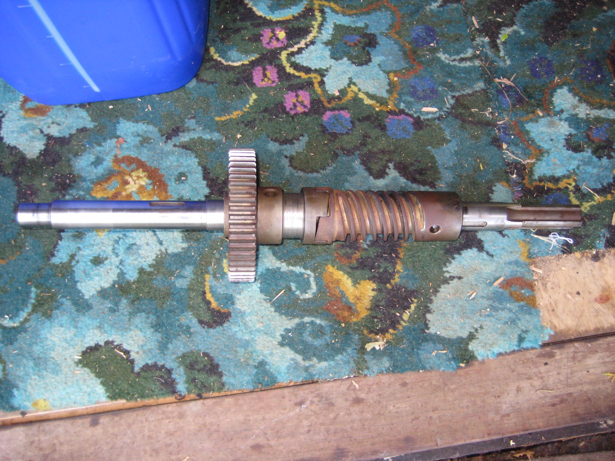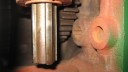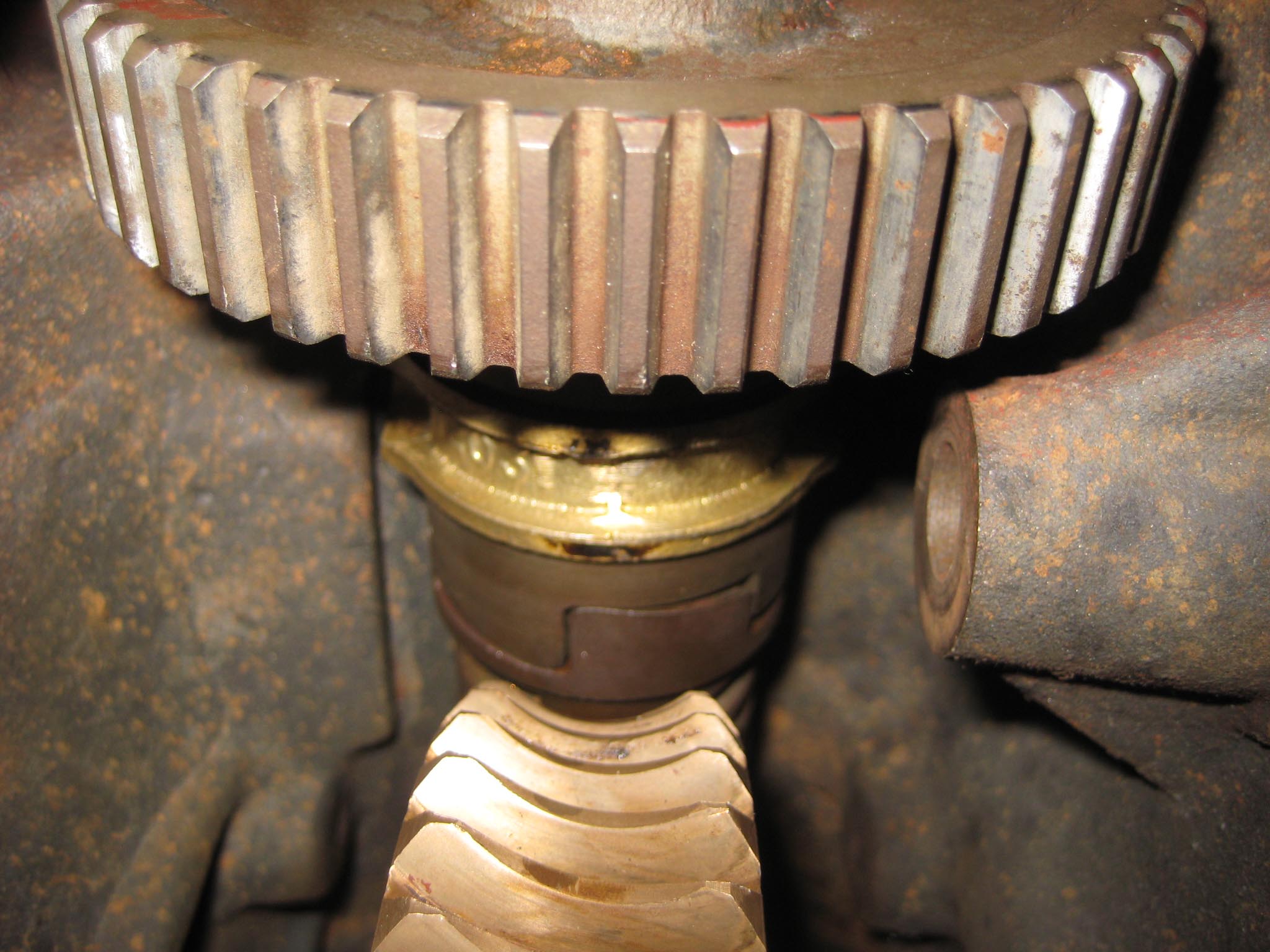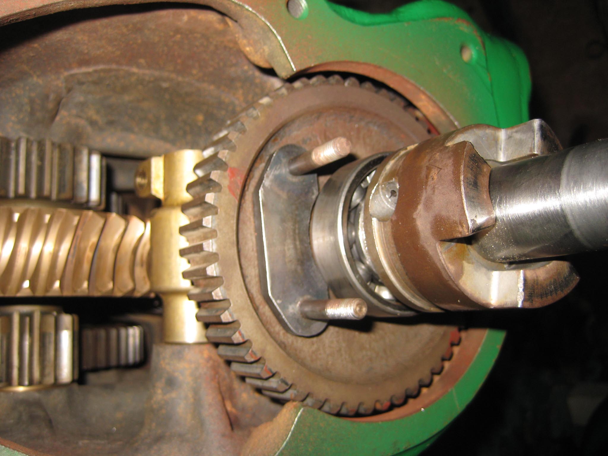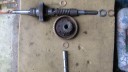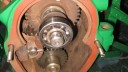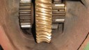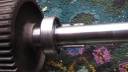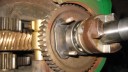 To complete the gearbox, the worm wheel assembly and worm drive shaft would need fitting next. Due to the worm drive shaft running all the way through the main gearbox and reverse motion gearbox, re-assembly is a little tricky. It took me a few dry runs to come up with a sequence which would work. I started by assembling the worm drive shaft. Slide the worm along the shaft until it is seated against the collar (Simar 0009). Fit the keys into the keyways on the shaft and then drive them towards and into the worm. There are holes in the worm so you can see when the key is fully home (Simar 0010). Slide the forward motion reduction gear onto the shaft, so that the clutch dogs can mesh together (Simar 0011). Fit the roller bearing so that it is tight against the stepped part of the shaft. I heated the bearing up using an old deep fat fryer which expanded the bearing just enough so that it just slid straight onto the shaft. I find this much easier than trying to drive the bearing into position. The keys for the reverse motion dog go on next. Note that one of the keys has a half moon shape machined into it (Simar 0012). This accomodates the 6 x 30mm roll pin that holds the reverse motion dog in place (Simar 0013). The worm drive shaft is now ready for fitting into the gearbox, but before this can take place, the worm drive gear needs to be inserted into the main gearbox casing first. The parts necessary where laid out to make sure I didn’t forget anything (Simar 0014). The worm drive gear was rolled into the main gearbox casing, making sure that the small gear wheel was on the same side as the low speed driven gear on the axle. One of the distance washers was then inserted between the inside face of the gearbox casing and the worm gear. I partially inserted the worm gear shaft into the gearbox so that it held the distance washer in place (Simar 0015). Fit the distance washer and thrust washer to the worm drive shaft and insert through the bronze bush at the rear of the gearbox. Now lift the worm gear up so that it is meshed with the worm. The shaft holding the distance washer in place can be pushed all the way through the worm gear. Fit the distance washer to the opposite side of the worm gear and continue pushing the worm gear shaft all the way through until it emerges from the casing. Note that this shaft has a hole through one end which must align with a corresponding hole in the gearbox casing. The shaft is then held in place by a 6 x 50mm roll pin.