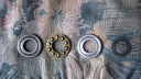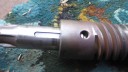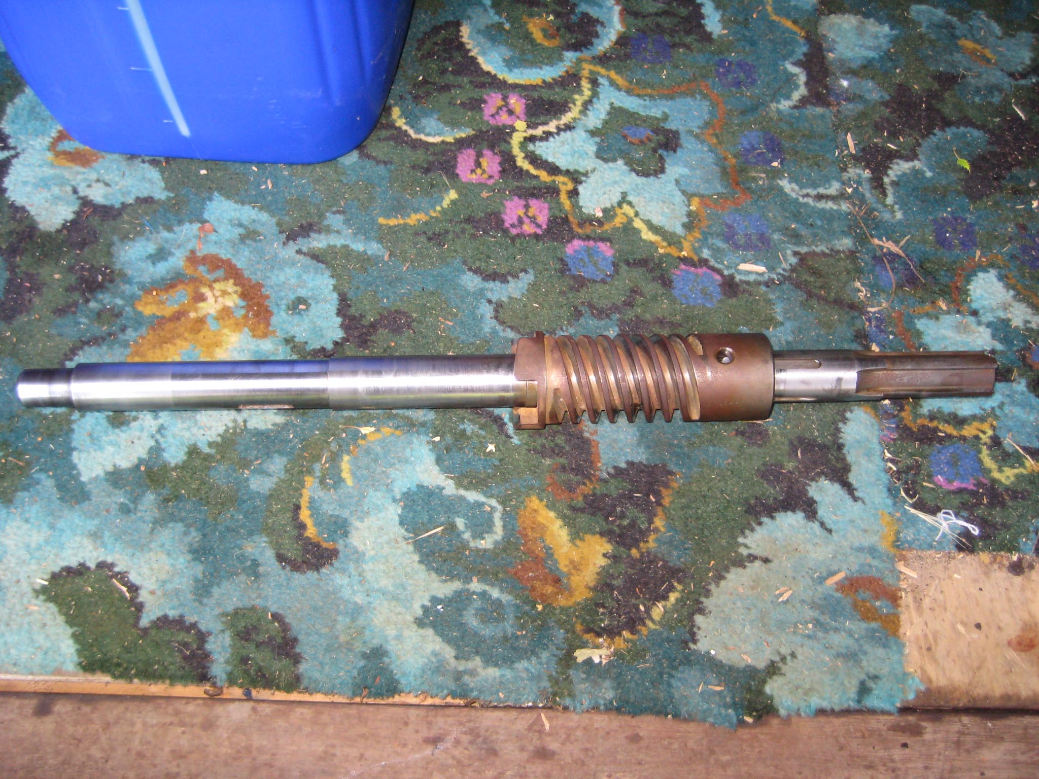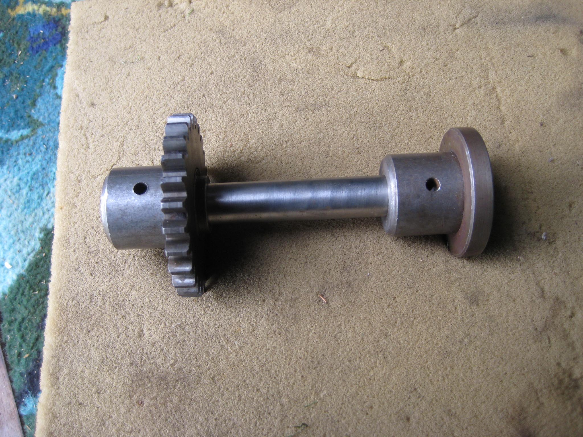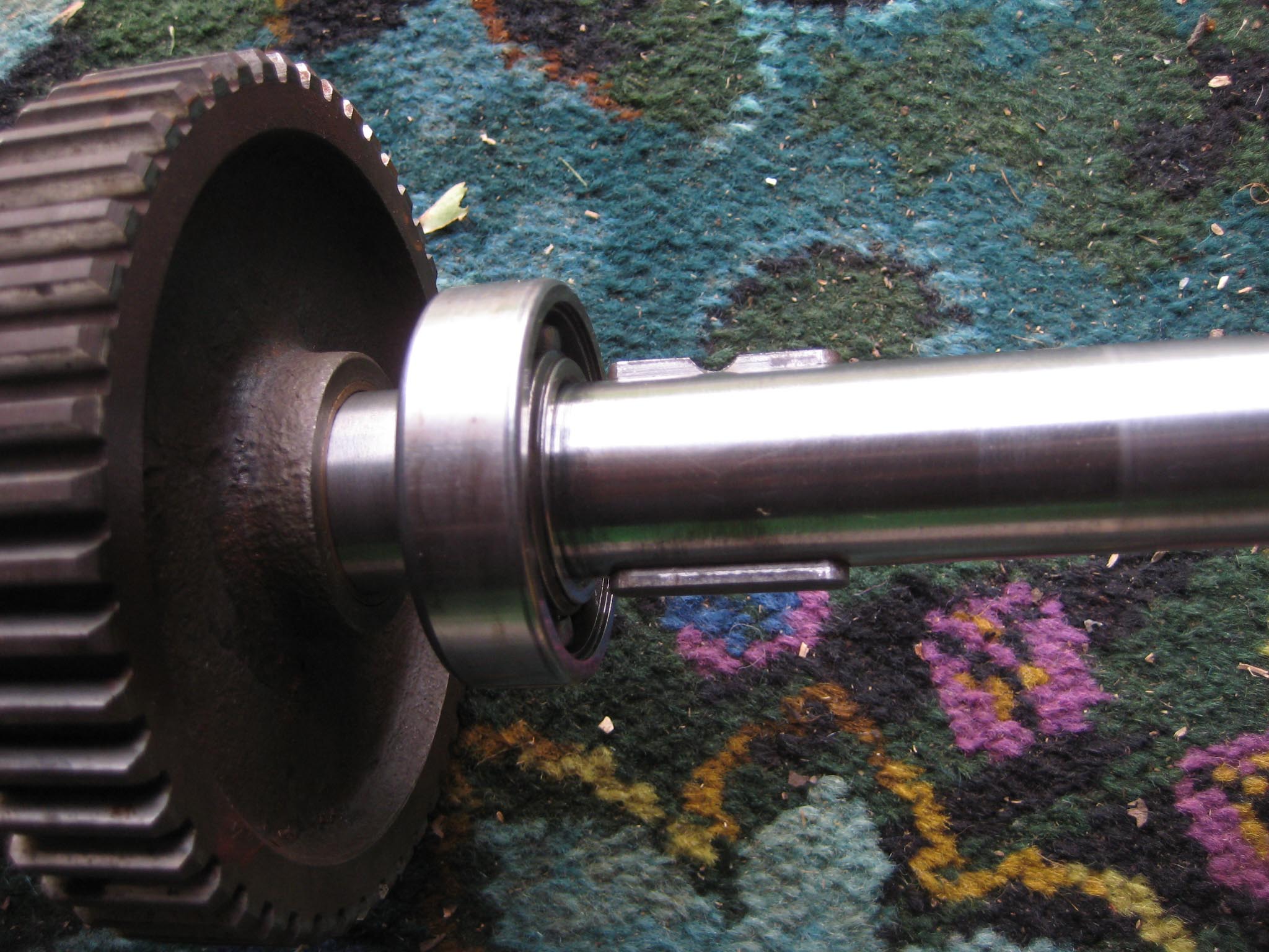 To complete the gearbox, the worm wheel assembly and worm drive shaft would need fitting next. Due to the worm drive shaft running all the way through the main gearbox and reverse motion gearbox, re-assembly is a little tricky. It took me a few dry runs to come up with a sequence which would work. I started by assembling the worm drive shaft. Slide the worm along the shaft until it is seated against the collar (Simar 0009). Fit the keys into the keyways on the shaft and then drive them towards and into the worm. There are holes in the worm so you can see when the key is fully home (Simar 0010). Slide the forward motion reduction gear onto the shaft, so that the clutch dogs can mesh together (Simar 0011). Fit the roller bearing so that it is tight against the stepped part of the shaft. I heated the bearing up using an old deep fat fryer which expanded the bearing just enough so that it just slid straight onto the shaft. I find this much easier than trying to drive the bearing into position. The keys for the reverse motion dog go on next. Note that one of the keys has a half moon shape machined into it (Simar 0012). This accomodates the 6 x 30mm roll pin that holds the reverse motion dog in place (Simar 0013). The worm drive shaft is now ready for fitting into the gearbox, but before this can take place, the worm drive gear needs to be inserted into the main gearbox casing first. The parts necessary where laid out to make sure I didn’t forget anything (Simar 0014). The worm drive gear was rolled into the main gearbox casing, making sure that the small gear wheel was on the same side as the low speed driven gear on the axle. One of the distance washers was then inserted between the inside face of the gearbox casing and the worm gear. I partially inserted the worm gear shaft into the gearbox so that it held the distance washer in place (Simar 0015). Fit the distance washer and thrust washer to the worm drive shaft and insert through the bronze bush at the rear of the gearbox. Now lift the worm gear up so that it is meshed with the worm. The shaft holding the distance washer in place can be pushed all the way through the worm gear. Fit the distance washer to the opposite side of the worm gear and continue pushing the worm gear shaft all the way through until it emerges from the casing. Note that this shaft has a hole through one end which must align with a corresponding hole in the gearbox casing. The shaft is then held in place by a 6 x 50mm roll pin.