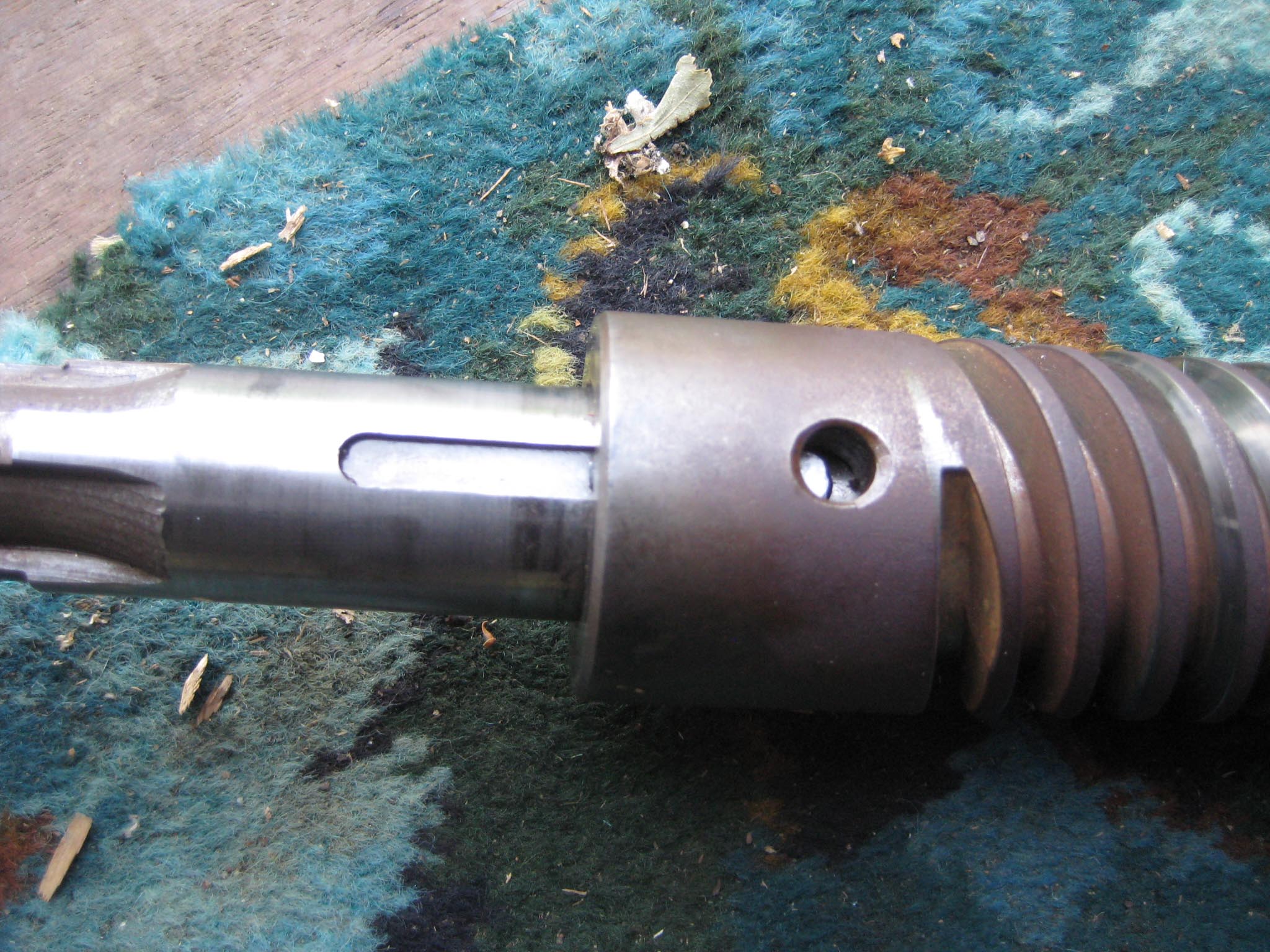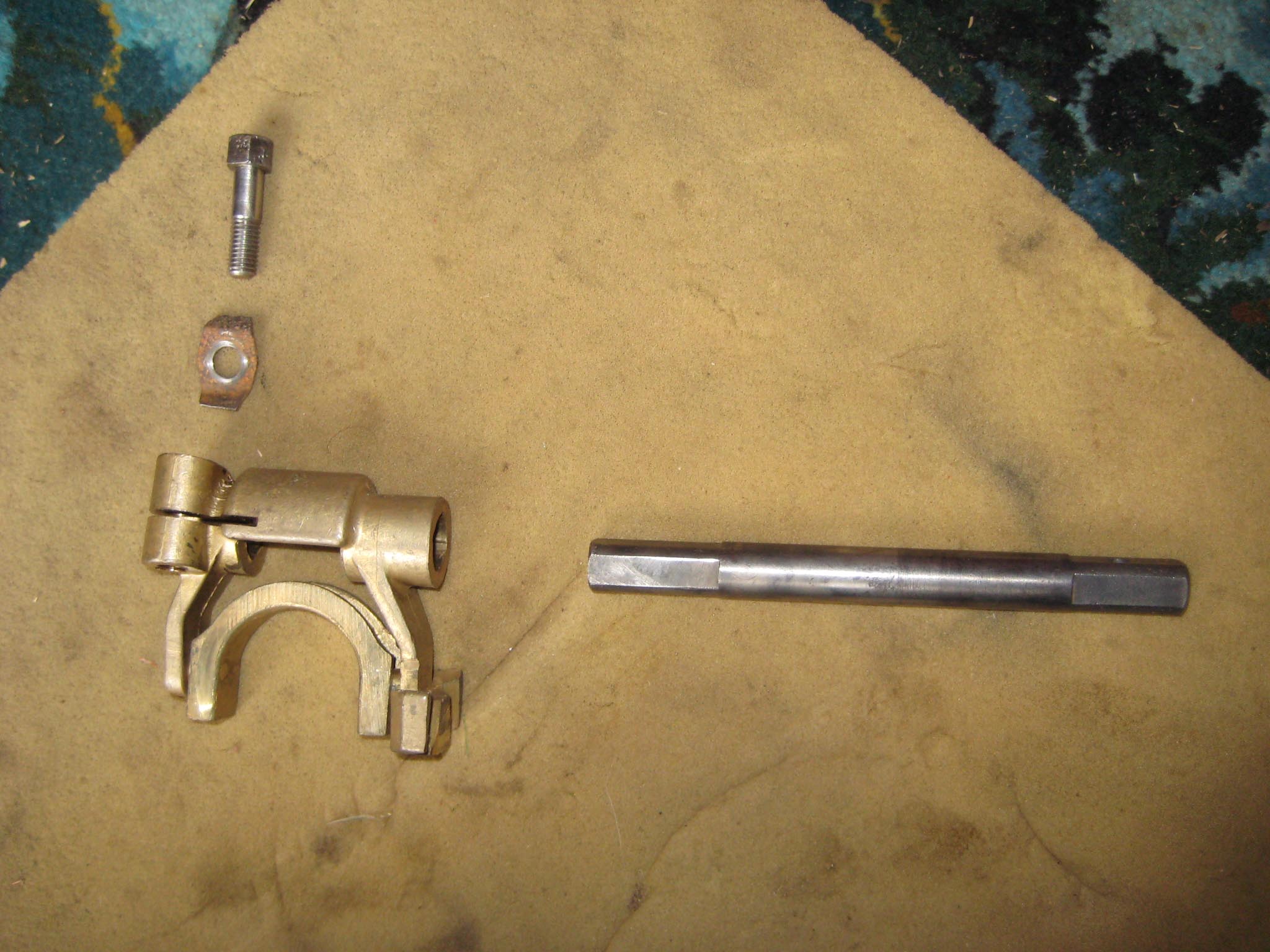 Next items to be fitted were the forward motion clutch fork, collar and shaft (Simar 0016). The clutch collar fits into a machined groove on the forward motion reduction gear (Simar 0017). This is easier with the gearbox stood on it’s rear end, pointing vertically upwards, otherwise gravity makes the collar drop out!! The hole for the clutch shaft can be seen just to the right of the collar. Slide the clutch fork into the collar and then insert the shaft through the gearbox casing into the clutch fork. The shaft is square at both ends, with the outside end being the one which has a hole drilled through it (Simar 0018). It is very important that the shaft is aligned as shown in the photo, otherwise the lever which fits onto the outer end of the shaft will be in the wrong orientation and won’t connect up with the control rods on the handlebars. The clutch fork clamps to the inner end of the shaft using a bolt complete with locking tab (Simar 0019).