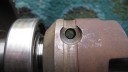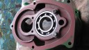 The crankcases were prepared for assembly by fitting new oil seals, 60mm O/D, 40mm I/D, 10mm wide for the rear crankcase and 47mm O/D, 30mm I/D, 10mm wide for the front crankcase (Simar 0061). The front crankcase also contains a double roller bearing (Simar 0062). As this bearing sits in a blind hole, it cannot be pressed out, so removal would require a special blind bearing removal tool which normally results in the bearing being damaged. As the bearing was in good order, I did not attempt to remove it. The rear crankcase contains a machined groove into which is inserted a felt washer (Simar 0063). A new paper gasket was fitted to the reverse gearbox casing (Simar 0064) and the rear crankcase secured into position on the three long M8 studs (Simar 0065). At the same time, the M8 x 50 bolts were fitted which secure the reverse gearbox to the main gearbox and rear crankcase to the reverse gearbox (Simar 0066). All were gradually tightened, in the same fashion as a cylinder head, to ensure an even pressure.