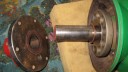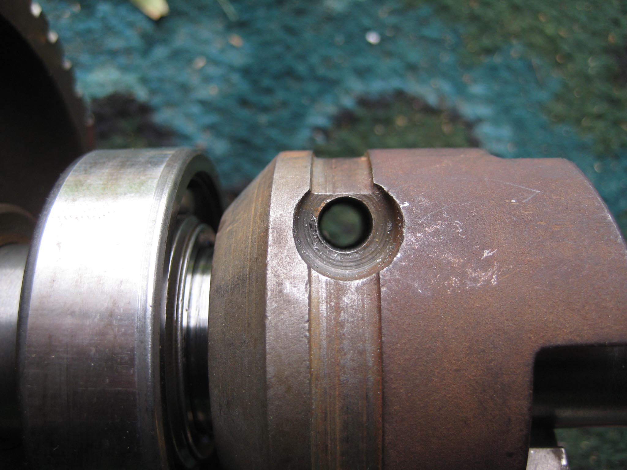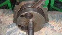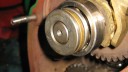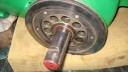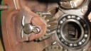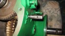 I next prepared the hubs for fitting onto the axle by installing the locking mechanism for the large pins which slot through the hubs into the driven gear sleeves (Simar 0038 & 39). Before the hubs can be fitted to the axle, the wheel flanges need to be installed (Simar 0040). Slide the Bronze washer onto the axle and then fit the two long keys into their keyways. Before sliding the hub onto the axle, make sure the felt washer is fitted into the machined groove on the back face of the hub (Simar 0041). At both ends of the axle shaft is a half moon shaped groove. This lines up with a hole in the hub (Simar 0042). An M12 x 75 bolt fits through this hole, making sure that the securing tab for the hub plug chain is fitted under the bolt head (Simar 0043).