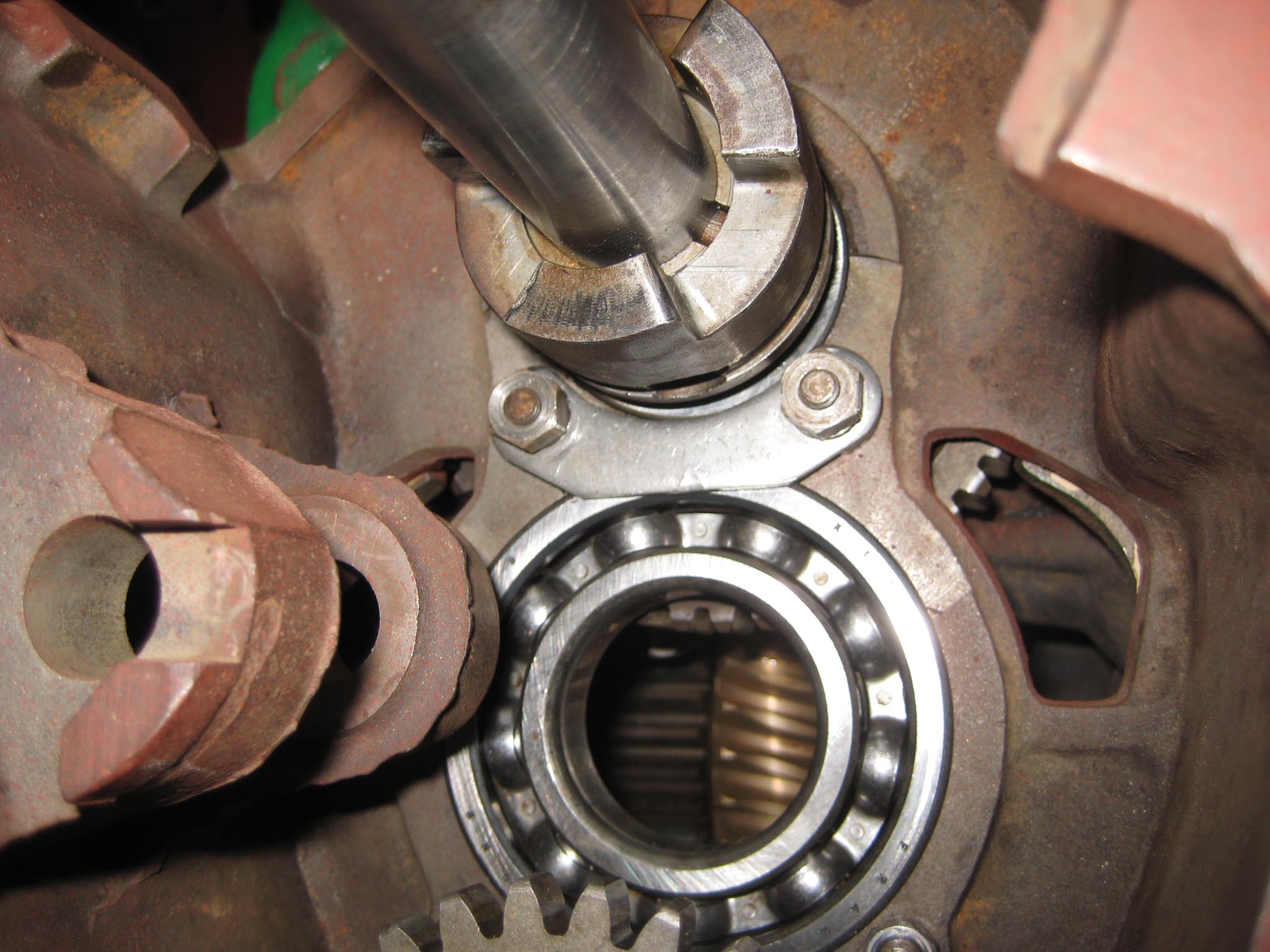 Before the engine could be fitted, there were a few items left to go in the reverse speed gearbox. The roller bearing for the end of the worm drive shaft went in first (Simar 0056), followed by the locking plunger for the reverse gear lever (Simar 0057). I did not fit the actual reverse gear lever at this stage, just in case I needed to manipulate the clutch when fitting the engine. To complete the worm drive shaft, a distance washer and thrust ring are fitted (Simar 0058), along with the clutch fork (Simar 0059). The clutch fork is held on the shaft via a washer and 4 x 20mm split pin (Simar 0060). When the legs of the split pin are bent over, they are very close to the reverse gearbox casing, so check the clutch operation a few times to make sure they don’t foul.