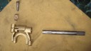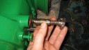 Before fitting the engine, I thought it would be best to have the handlebars back in place to make it easier to counterbalance the weight of the engine. The steering column assembly is attached to the rear of the main gearbox by four M8 studs, of which the two longer ones are fitted towards the rear. There is also a paper gasket between the gearbox and column (Simar 0049 & 50). Before fitting the swivel head for the handlebars to the steering column, the steering release plunger needs to be fitted (Simar 0051). Note the orientation of the collar to the right of the spring which includes a cut out for a 5 x 30mm roll pin. Slide the swivel head onto the top of the steering column, ensuring that the release plunger locates into one of the 3 tapered holes at the top of the column. With the swivel head in position, insert the pivot pin (Simar 0052). The pivot pin is locked into the swivel head using two 8 x 50mm roll pins. At the lowered end of the pivot pin, fit the washer, spring, collar, M16 castellated nut and 4 x 35mm split pin (Simar 0053). Note that the picture shows these items in the fully loosened position.
