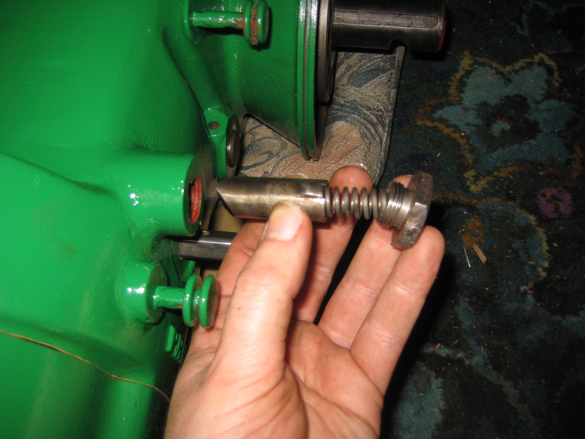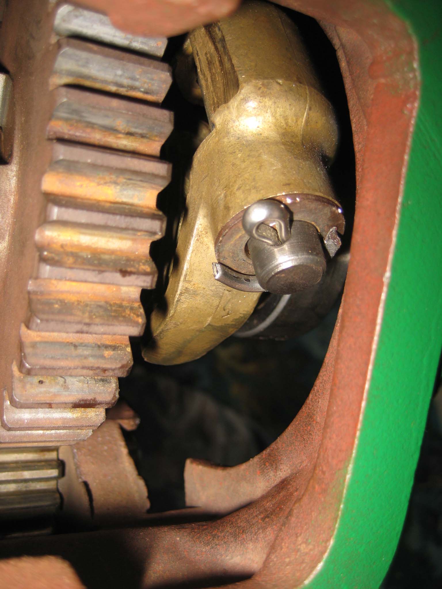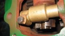 Before the reverse motion gearbox can be attached to the main gearbox, fit the three long M8 studs into the main gearbox and then the paper gasket (Simar 0023). Place the roller bearing securing bracket loosely onto the forward motion reduction gear, making sure that the gear is out of mesh with the worm, i.e. is at it’s furthest forward position (Simar 0024). Now for the tricky bit!! Lower the reverse motion gearbox, so that the two studs on the roller bearing securing bracket begin to protrude through the two holes in the casing (Simar 0025). As the securing bracket isn’t attached to anything, a degree of patience is required to joggle it into location. Fortunately, the rear crankshaft roller bearing has a sufficiently large enough inner diameter to allow access for a couple of fingers!! A further complication is that the casing has to fit onto the bearing on the worm drive shaft which is a press fit. Mine went on with a few well placed blows with a rubber mallet. Once the reverse motion gearbox casing is in position, place the gearbox so that it is sat just past horizontal, with the front lower than the rear. Gravity will then keep the roller bearing securing bracket in position while the inner securing plate and nuts are fitted (Simar 0026). Final bits to go in are the safety spring for the reverse motion dog (Simar 0027) and reverse motion pinion gear (Simar 0028 & 29) which is simply held in place with a couple of 6 x 30mm split pins. There are a few more items which need to be fitted onto to the worm drive shaft, but I decided to leave those off until the engine is ready to be fitted. Final job for the day was to fit the forward motion clutch locking plunger, which simply pushes into a hole in the main gearbox casing (Simar 0030). Note that the photo does not show the fibre washer which fits to the threaded plug.