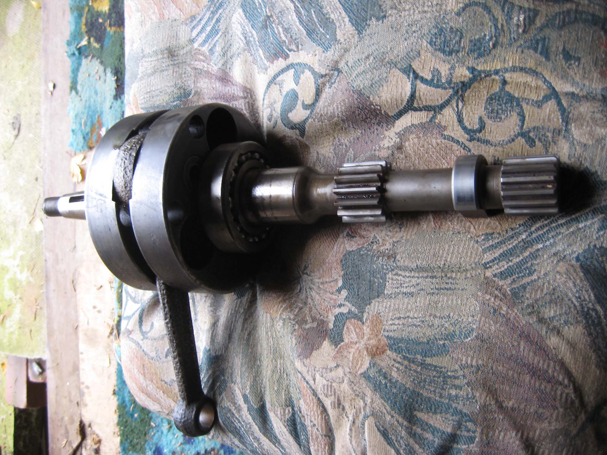 I did not take the engine crankshaft apart (Simar 0067), as reassembling would require a jig to ensure both front and rear sections of the crankshaft are perfectly concentric. The whole lot was slid into place, taking care not to damage the oil seal in the rear crankcase (Simar 0068). A distance washer is fitted up against the front flywheel before the front crankcase is installed (Simar 0069). The front crankcase is fixed to the rear crankcase by two M8 x 55 bolts. The other four vacant fixing holes visible in the photo also carry the front cooling fan casing. Four short M8 studs and paper gasket were then fitted ready for the cylinder barrel (Simar 0070).