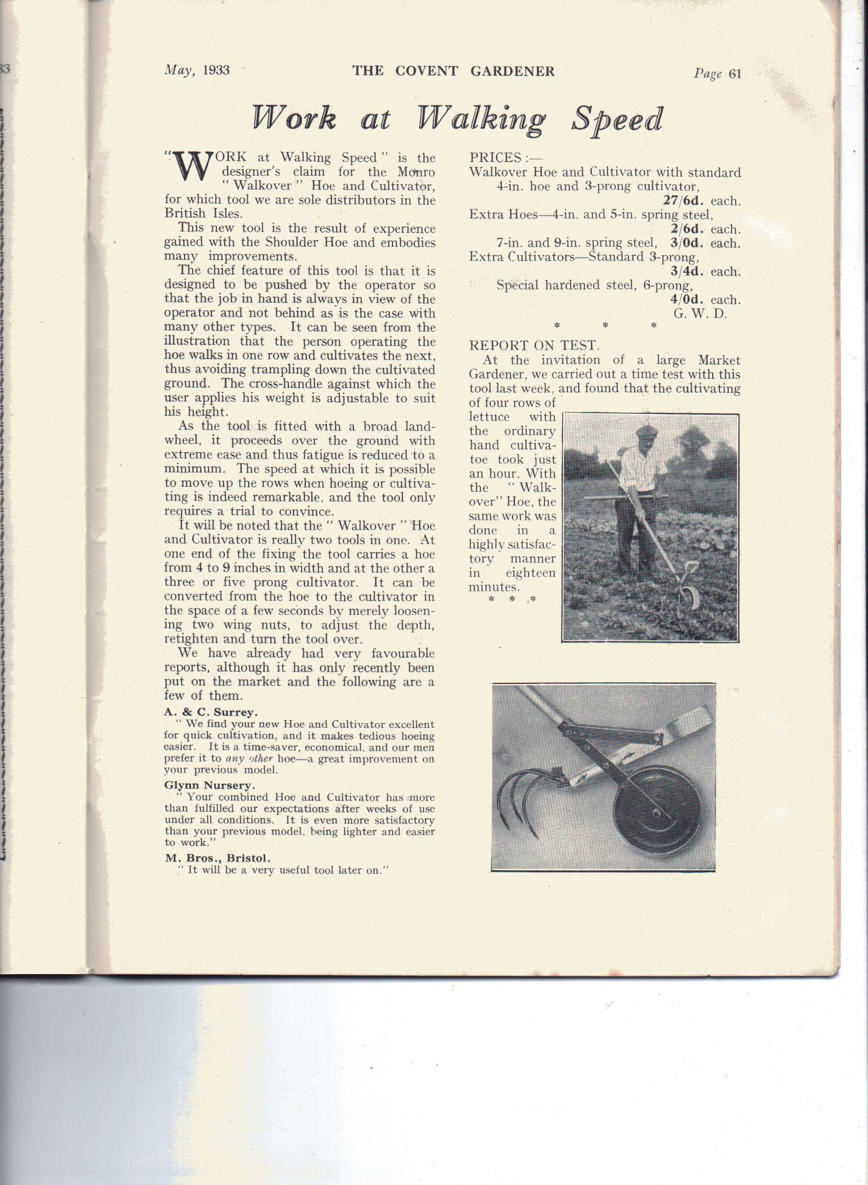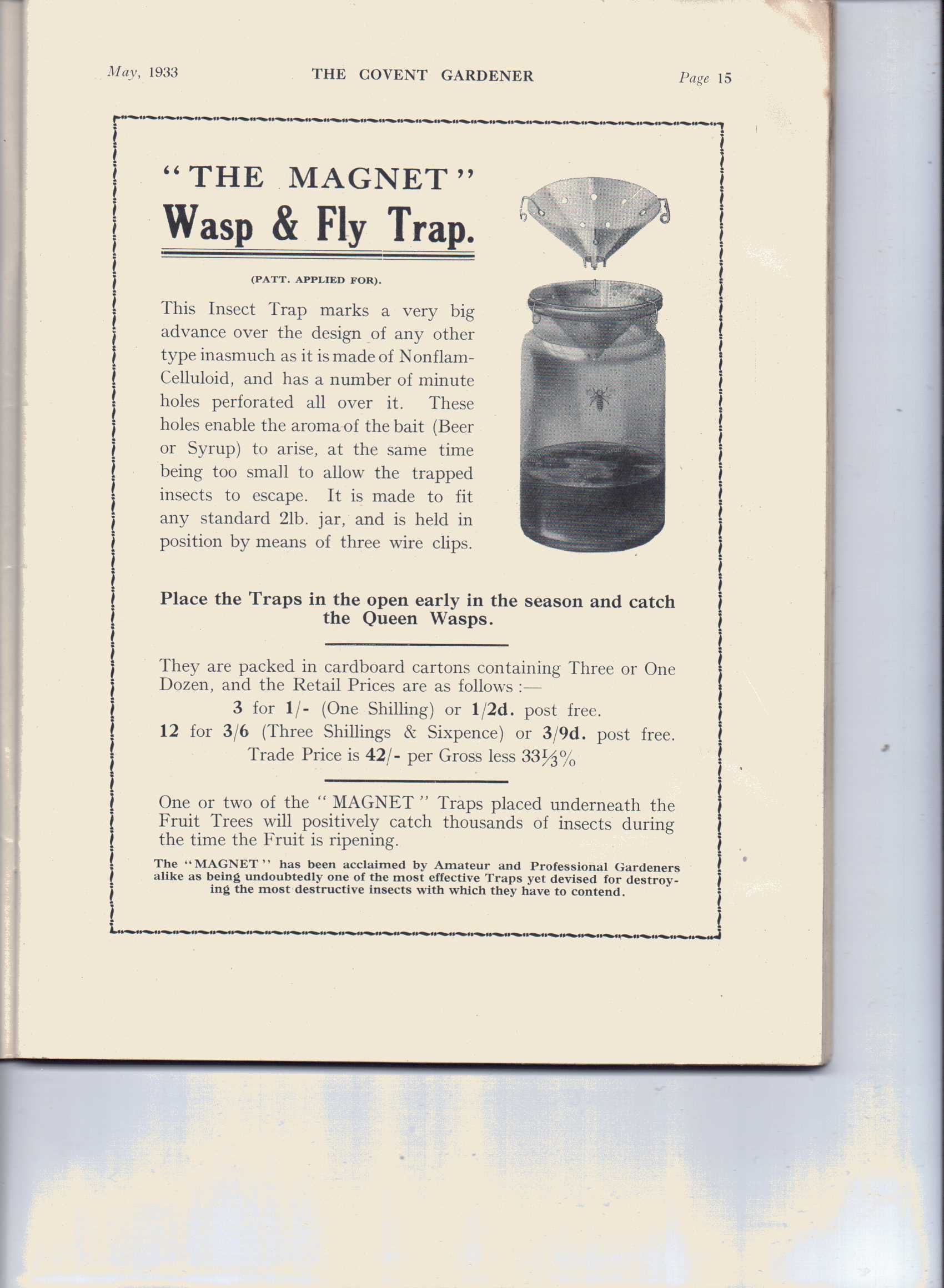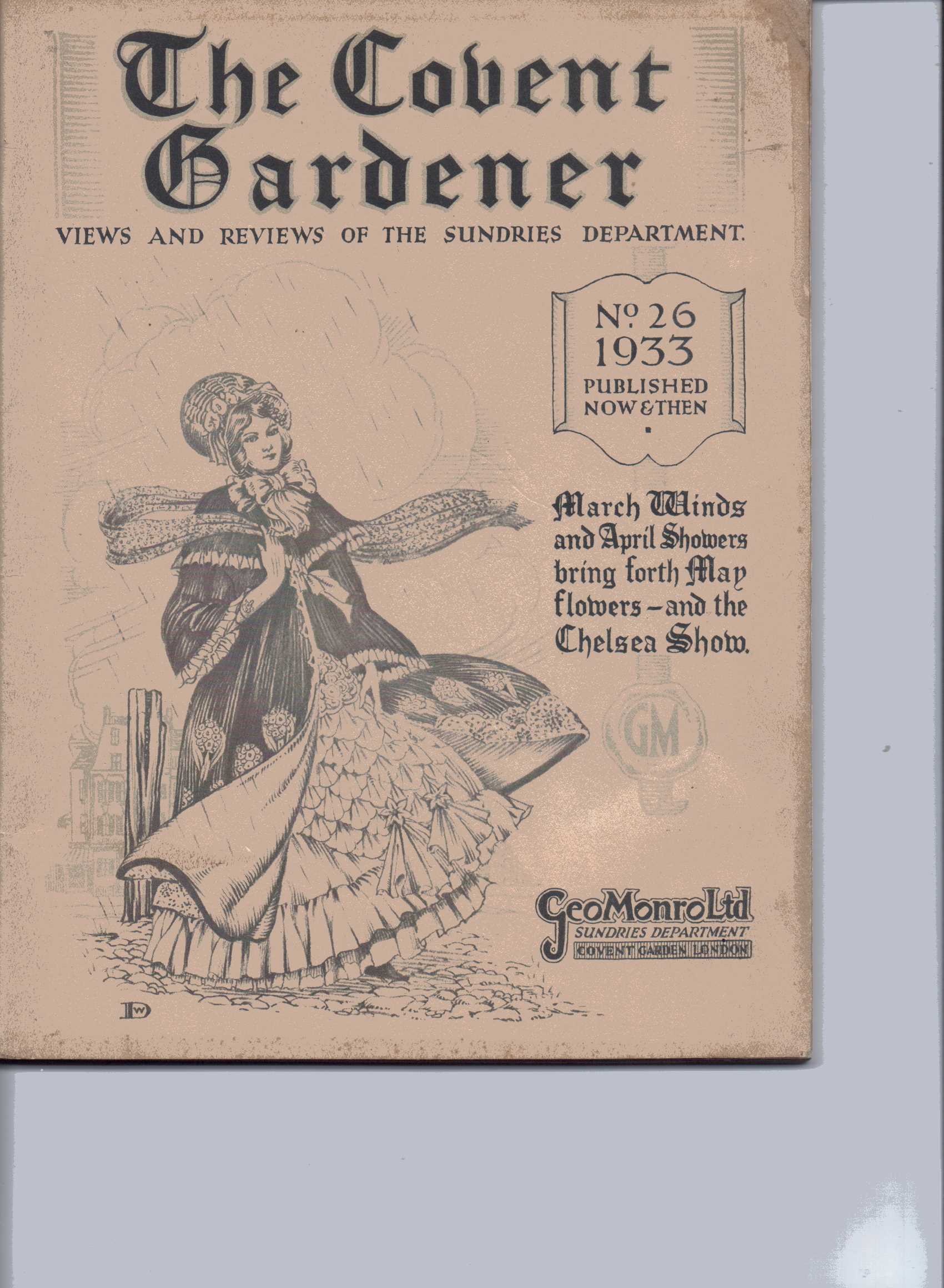 A recent find and purchase on e bay, The Covent Gardener dated May 1933. It appears to be a Geo Monro publication with various articles and advert showing some of their products, such as the Magnet wasp and fly trap and the Walkover hoe and cultivator.