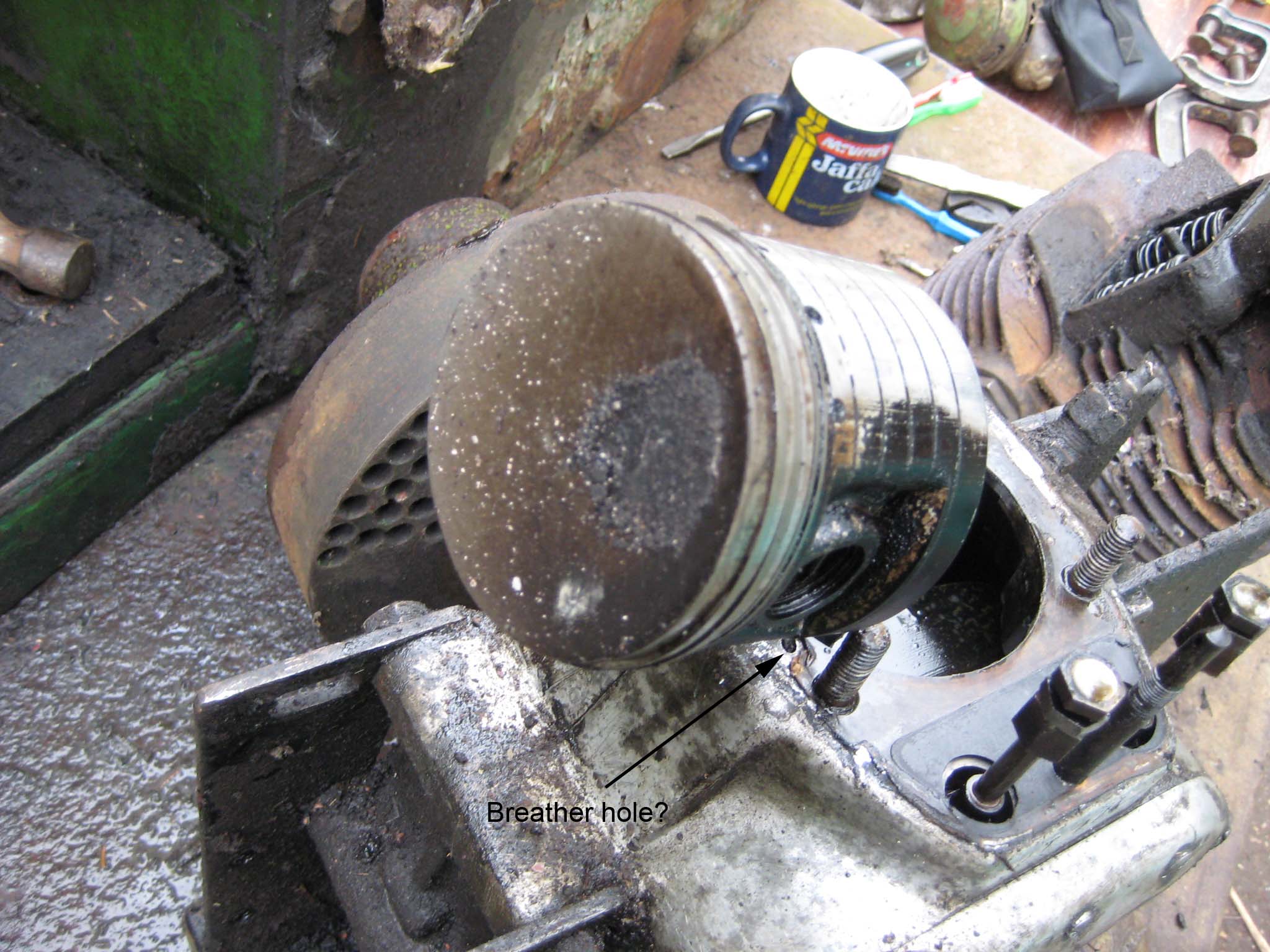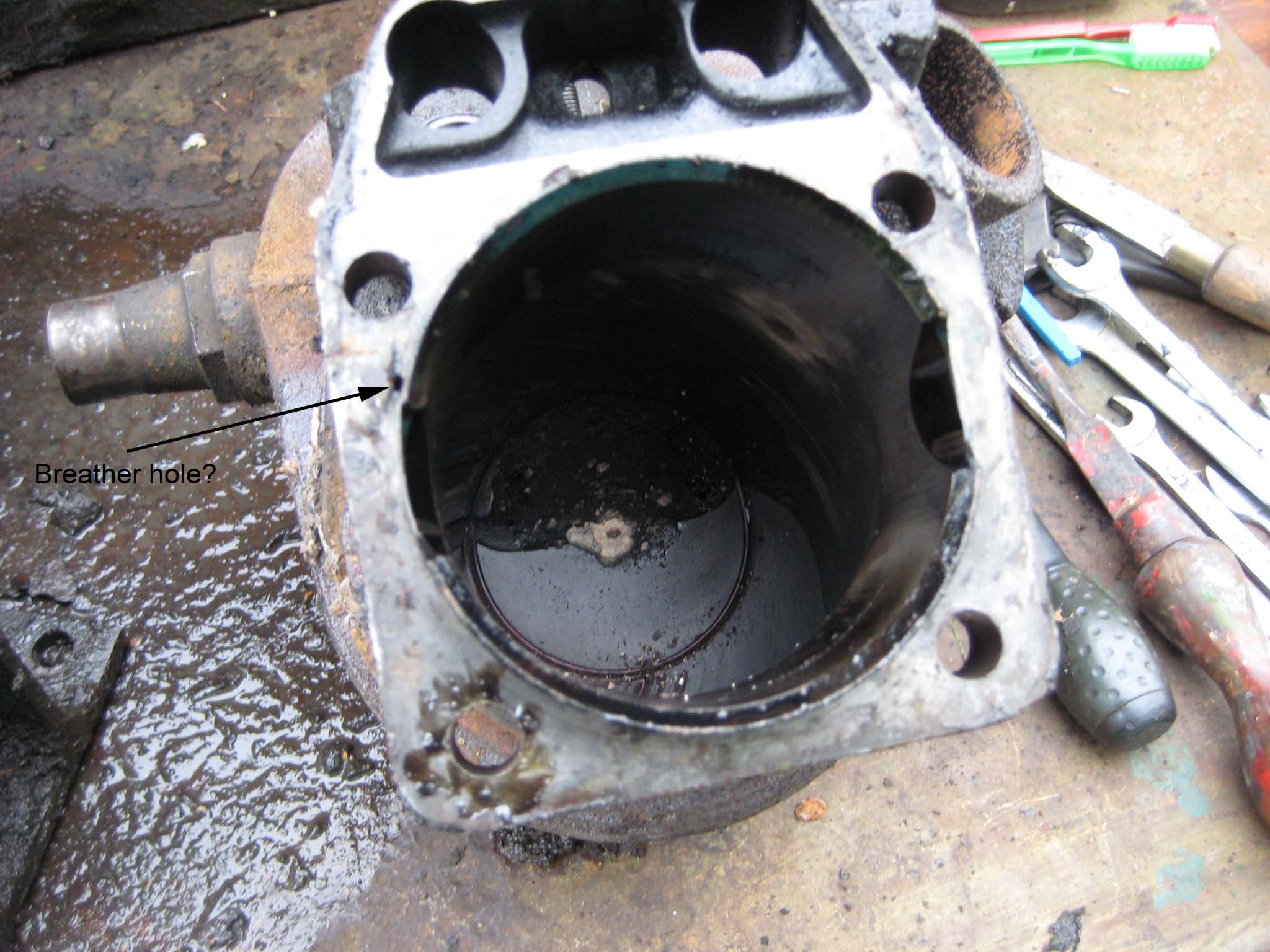 trusty220KeymasterI’ve been poking bits of wire into all sorts of holes this weekend, and the one that Sean is pointing out is actually a pressure feed from the pump. It corresponds to a hole drilled in the cast iron barrel which exits about 1/3rd of the way up the bore. The only use I can see for this is to lubricate the piston skirt- maybe they had a problem with overheating caused by excessive friction in the bore- so I will have to drill a hole in my new spacer to allow oil to flow through.