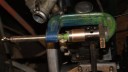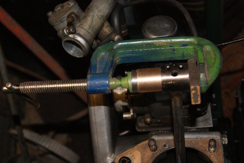 Now that I know that I can get a replacement I decided to remove the old one. As you can see from the pictures I made up a puller from a long bolt with a washer at one end to engage the bush. At the other end was a tube that the bush would slide into, with another larger washer and the nut on the other end of the bolt. As the nut was tightened it pulled the bush from the con rod into the spacer tube with no risk of bending the con rod. I now have a bare con rod awaiting the new bush, so fingers crossed!