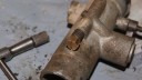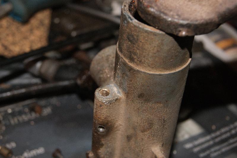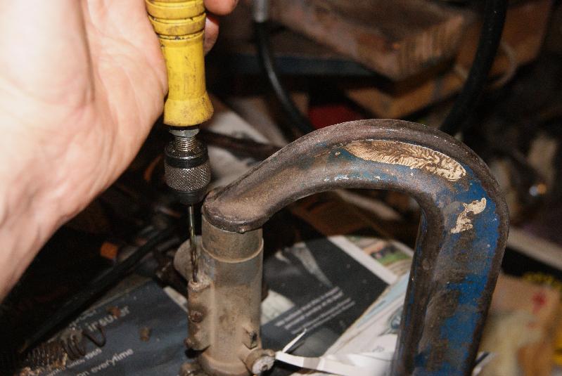 Access to it is easy enough, but it runs parallel to the main venturi pipe and so I couldn’t mount it in the pillar drill because the chuck is too bulky to get anywhere near. The solution was to use a flexible drive, very much like a scaled-down Tarpen arrangement, driven off the chuck on the pillar drill and used hand-held with some long drill bits. The much smaller chuck could just get in alongside the barrel and I took the jammed jet out in stages up to 3.5mm. You can actually see the drilled hole starting to break through to the threads in the one photo.