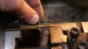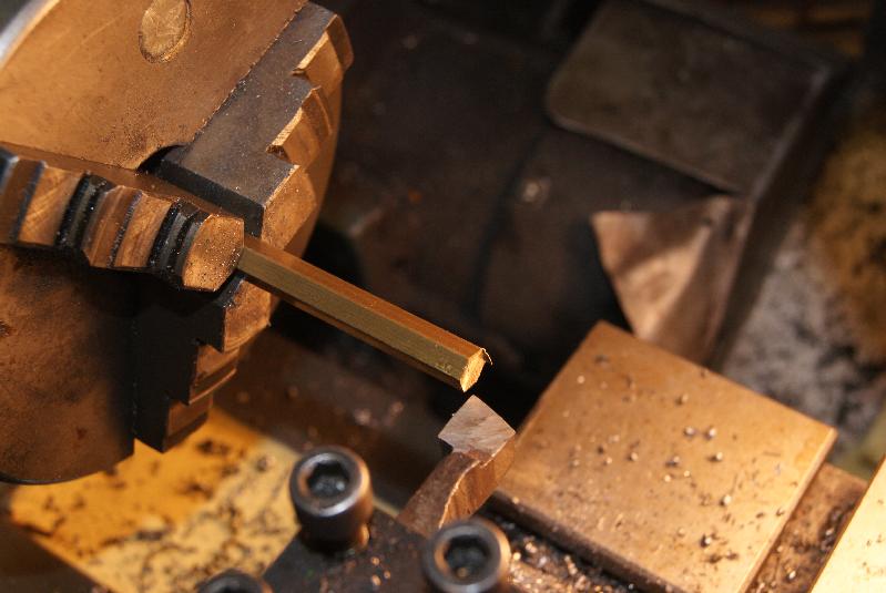 You will see the different stages of making the slow-running jet from the photo’s, but basically you start with hexagonal brass bar 5/16″ across flats. Mark off the length of thread and shank and turn it down to the external thread size- in this case the thread is 3/16″ Whitworth, so you turn it down to 3/16″ or .185″.