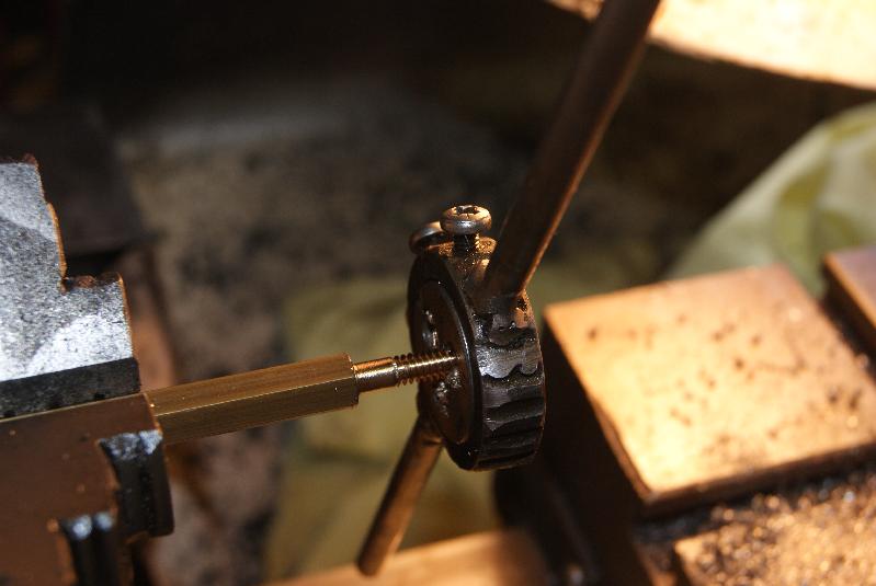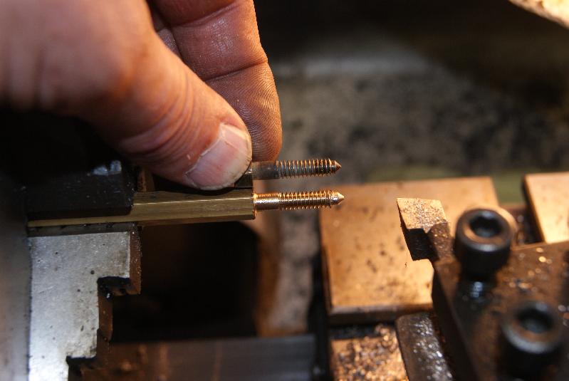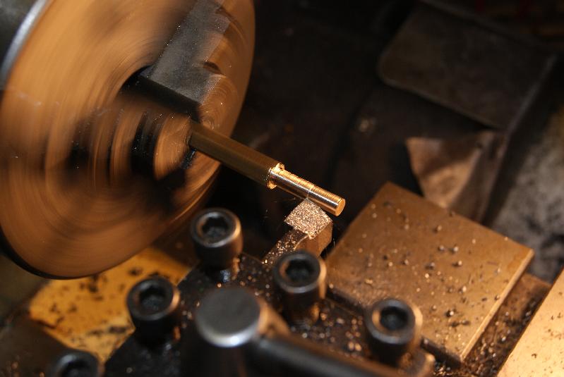 I chose to put the thread on by hand with a die in this case because the thread is tiny and my eyesight is non too good on the small sizes to cut it with the lathe. The result was acceptable, so to finish the end off I turned a cone onto the tip of it and relieved the thread back about 1/16″ to copy the original.