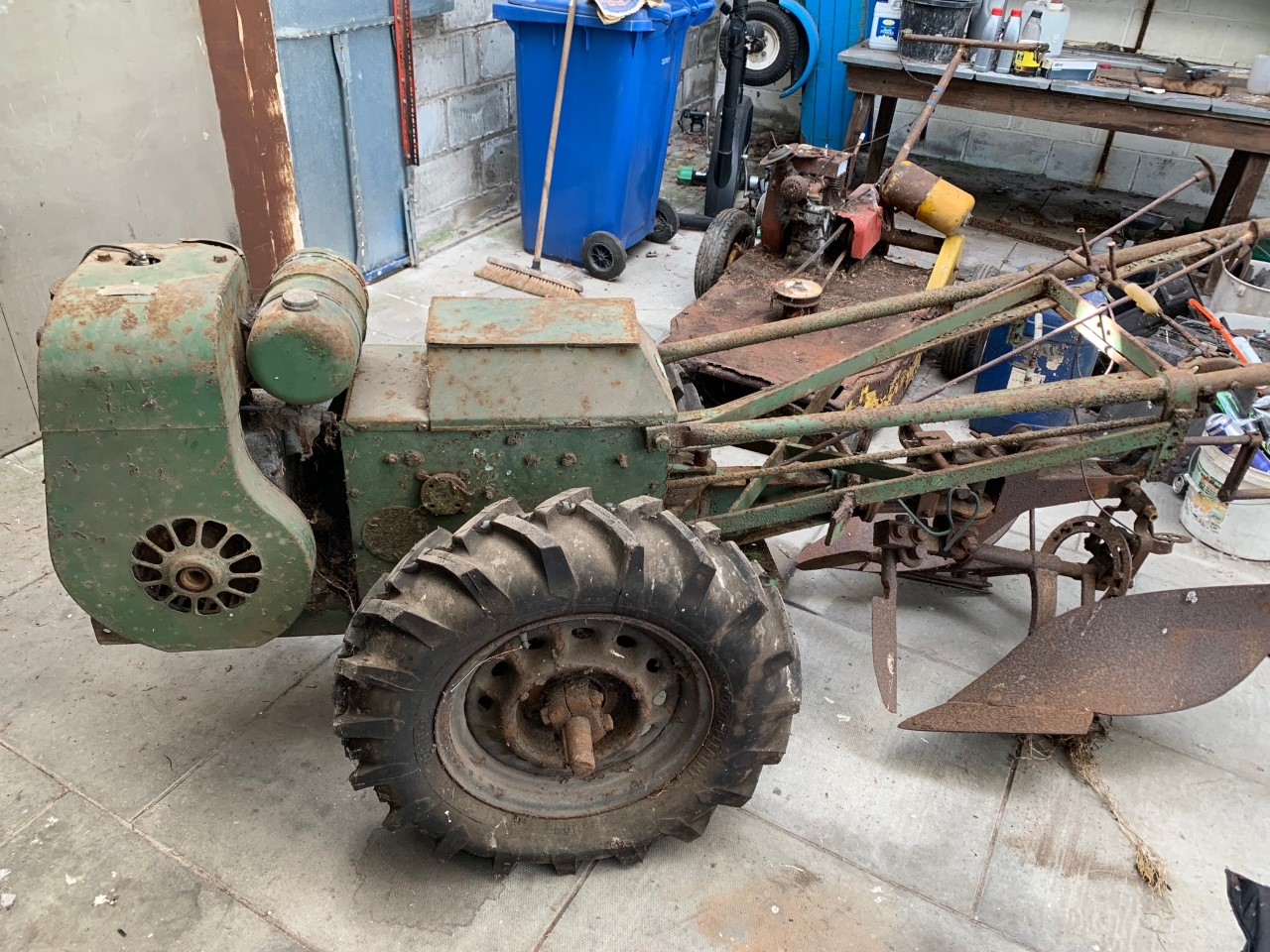 Later, local additions appear to be the two toggle handles and operating rods that disappear into the rear of the transmission casing- I wonder what they do? Perhaps you’ll enlighten me! Also the wheels aren’t the standard 2-wheel tractor wheels but they bear a similarity to the ones fitted to the front axle of the Mk1 Trusty Steed, so I can’t say for certain that they are factory fitted or not; at least they’re unusual!