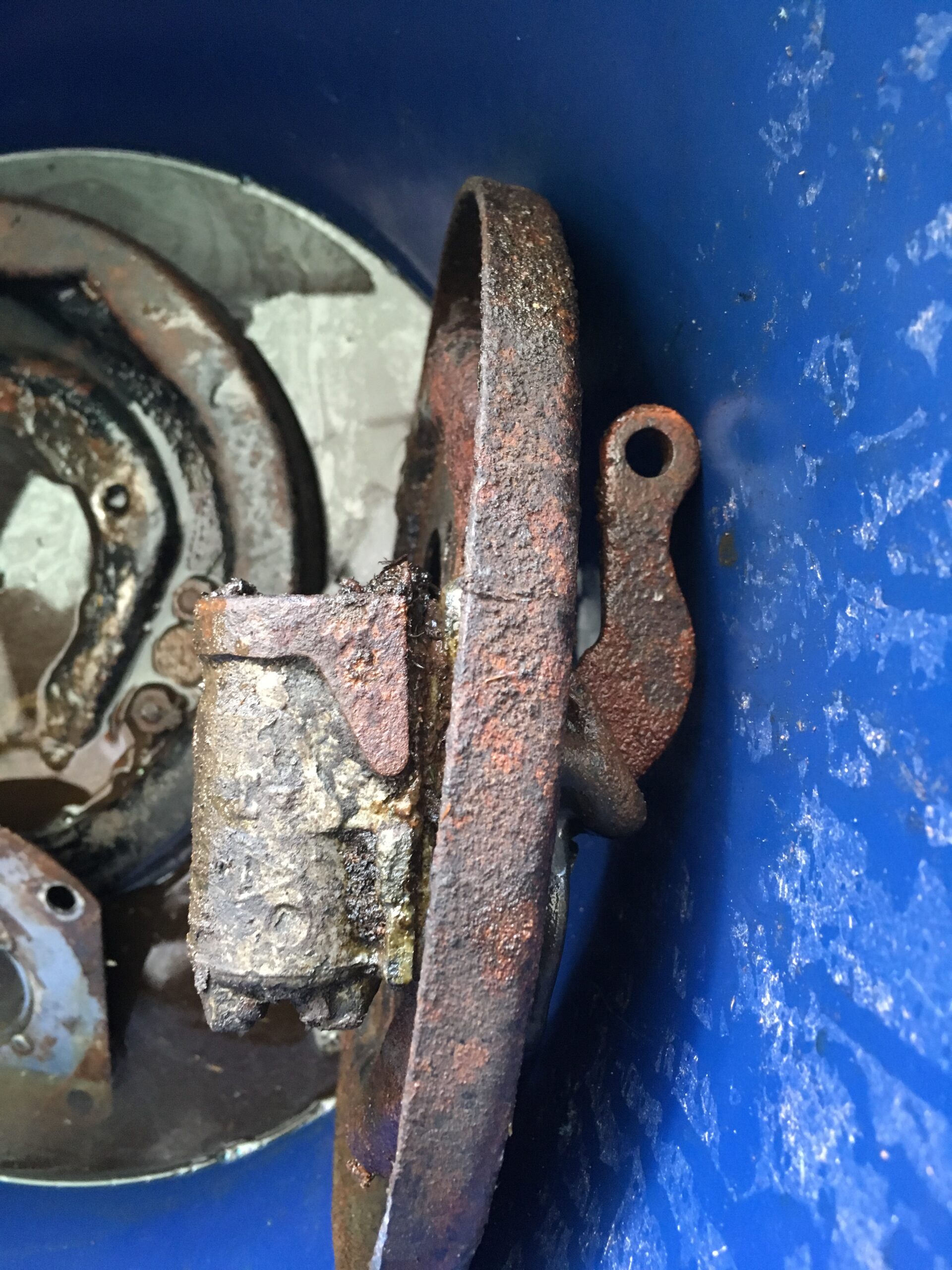 so now thinking this good side with the MM cylinder may have been a bodge,and yet was the better side which i stripped down…as you said charlie I’d have expected the brake parts to be off the shelf cheap as chip’s item’s from back when these were made,but what was around back when these were built?? not alot with 5 stud fitment and even the drum backing plate is an odd one – spend hours looking at images of parts from late 70’s – 80’s to see if i can find a match