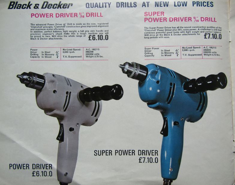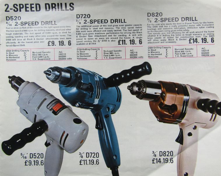 I’ve scanned in the Black & Decker brochure (8 pages) and attached it to this thread. It’s pre-decimal, but I also see that when the first Argos catalogue was out in 1973 they were selling B&D stuff. The basic drill was a 3/8 chuck single-speed with a recommended price of £9.84 but Argos would sell it for £6.55 – an absolute bargain!