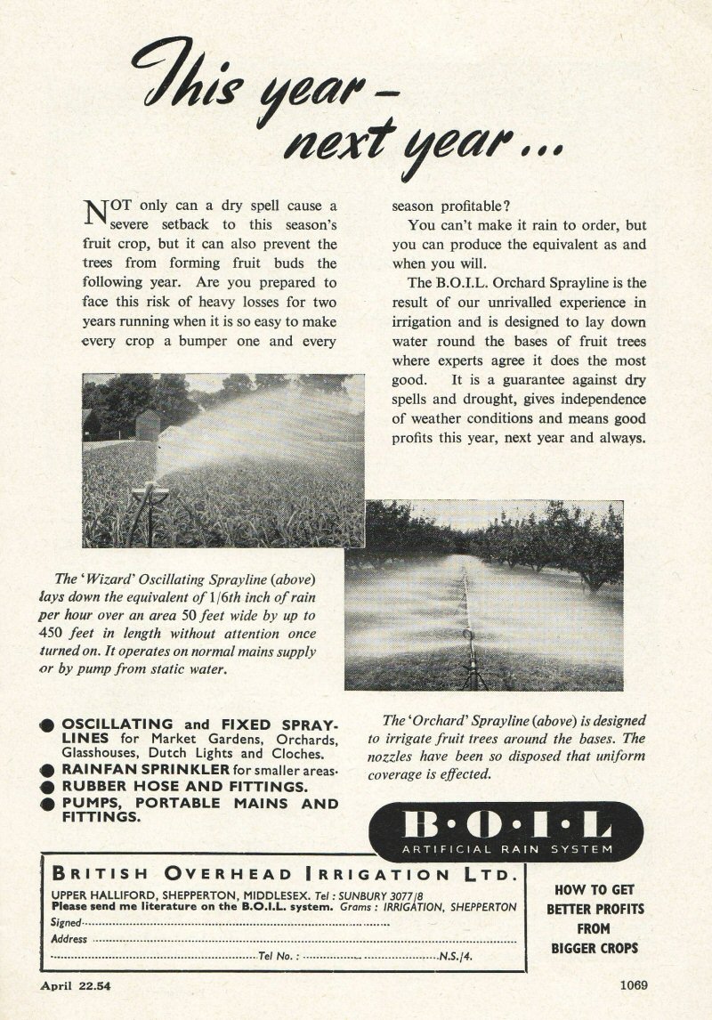B.O.I.L were for many years based at Upper Halliford, Shepperton, Middlesex. I’ll quote the text: “They specialised in artificial rain equipment, the principle being the projection of jets of water in such a way that it atomises and falls naturally to simulate rain”.