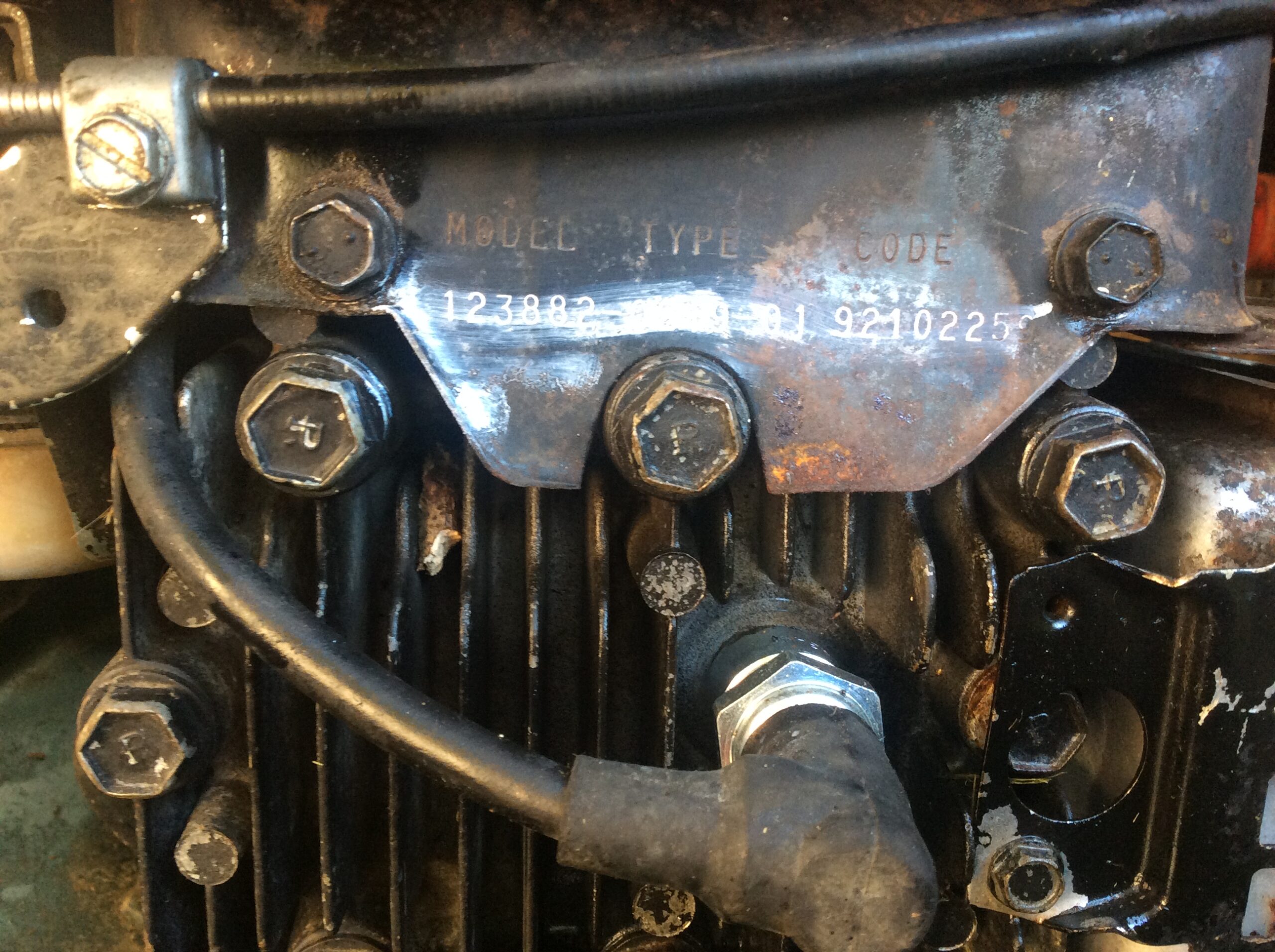 This will determine the coil that you need. Pre ‘79 it is likely to be a points ignition magneto – that is, under the flywheel will be contact breaker points and a condenser. The good news is that a modern Magnetron, electronic ignition coil may be fitted, without having to dig around under the flywheel. Even better, most small engine / mower repair shops will have a box of good coils removed from scrap engines .Example only, your numbers will probably be on the vertical face behind the carburettor.