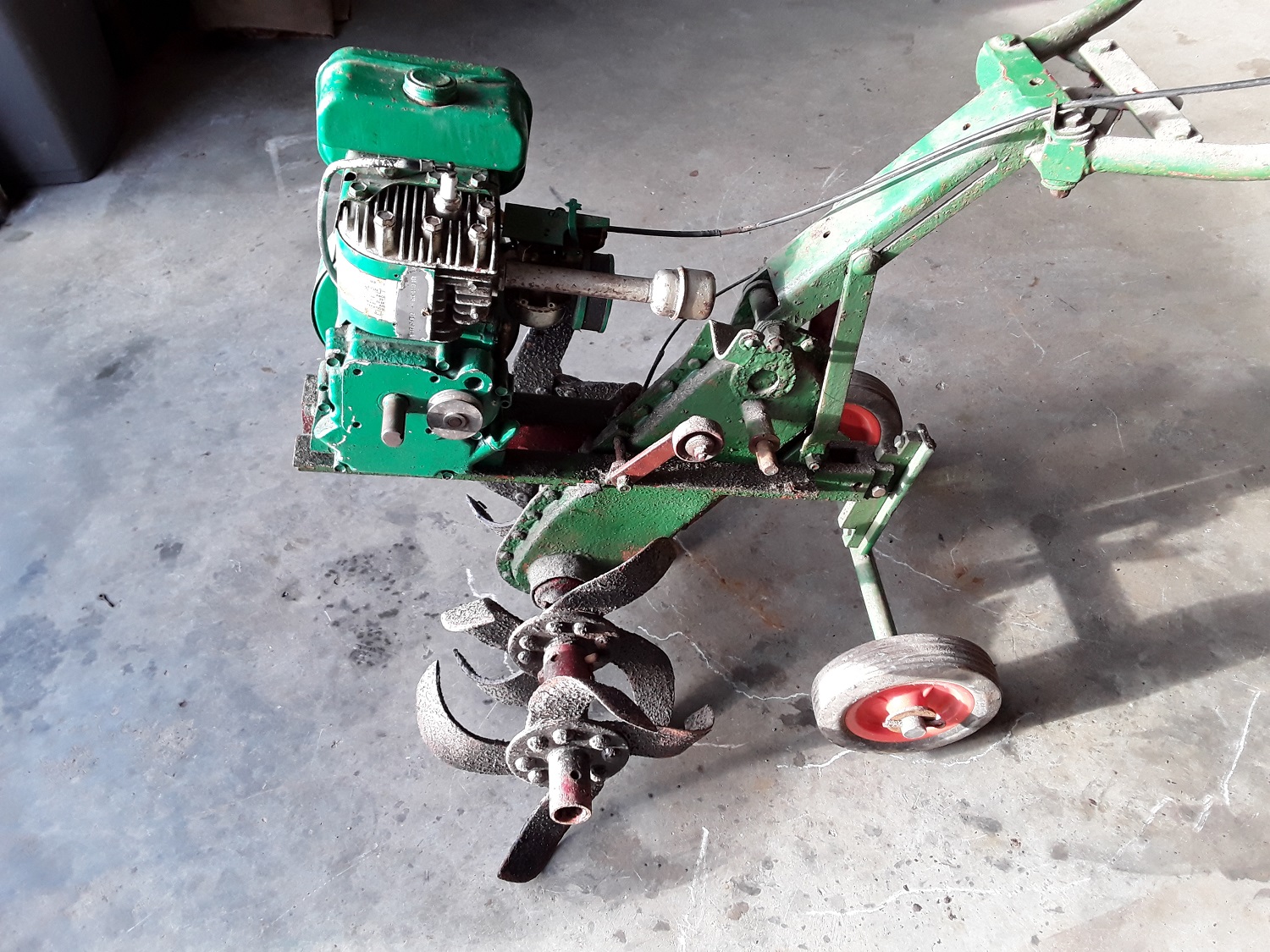It is largely a Merry Tiller that has had a green repaint and lost its belt cover, drive box input pulley, engine pulley and the vital belt guide. It has an improvised transport wheel set from…[Read more]