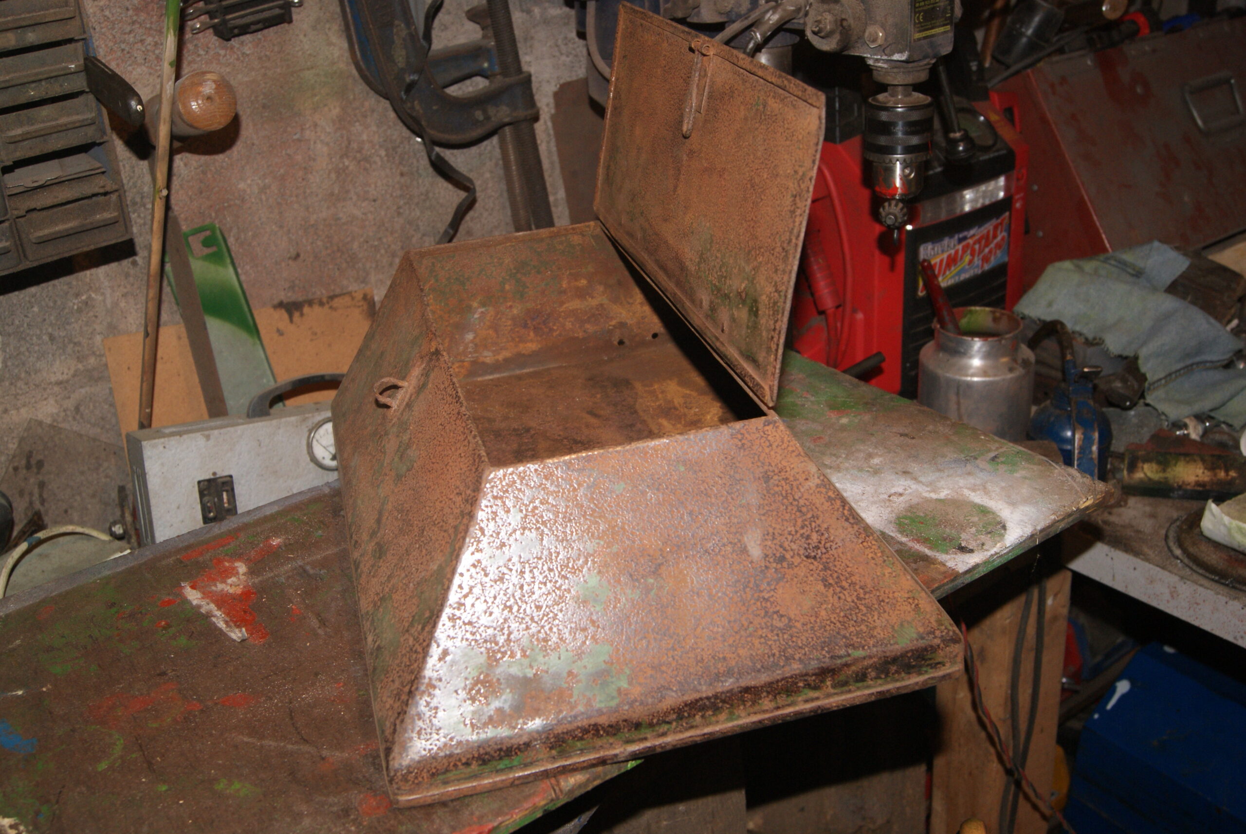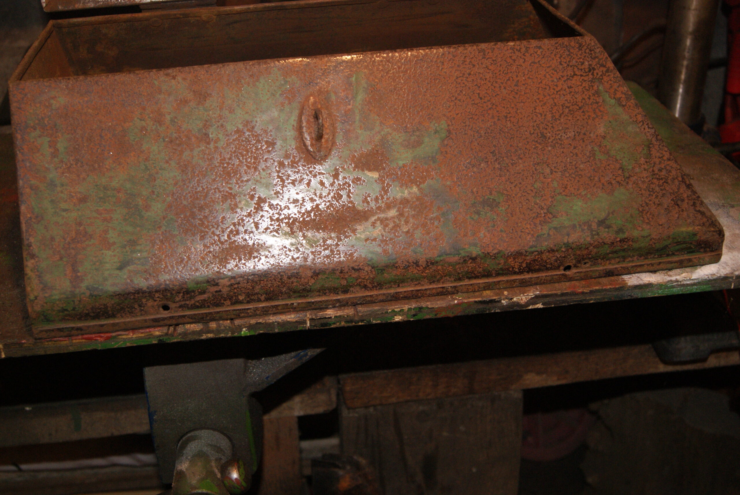 In the meantime……..back in the garage the toolbox and front cover have come in for the usual treatment. Whilst it looks the same as all the others, it does have a few differences- don’t forget this is really the Mk1 version of the toolbox. The first thing that struck me was the external hinges to the lid when all of the others I’ve done have had the hinges made from the wired-edge of the toolbox sides. Comparing it to factory photo’s it is correct and so the hinges will be kept as they appear. Another mystery is the attachment of the front cover to the tractor; there are no holes in the side plates of the tractor to put the retaining screws through and there are two holes in each side of the toolbox at the lower edge- did they intend to bolt the toolbox to the sideplates and have a lift-up front cover? Possibly, but looking at old photo’s the front cover appears to be bolted through the side plates. Oh dear, I’m getting that headache again…….