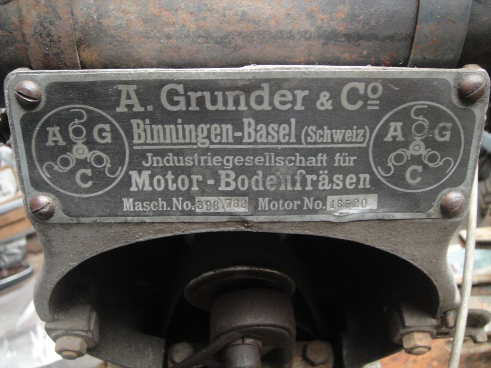 i’m from Switzerland and unfortunately I don’t speak english!To the Pictures: this is a license of a Grunder Tiller (built by Grunder & Co Binningen / Basel, Switzerland from 1917 untill to 1925), and the Engine seems (license?) M&V: Müller & Vogel St. Aubin, Suisse.