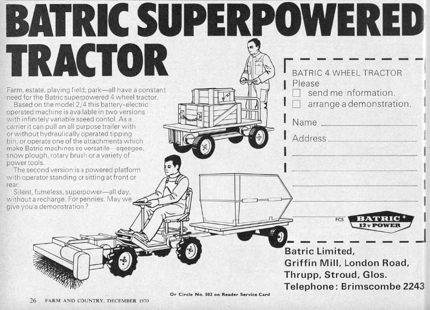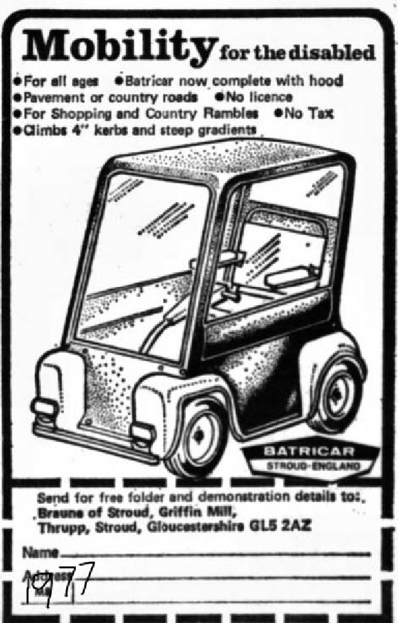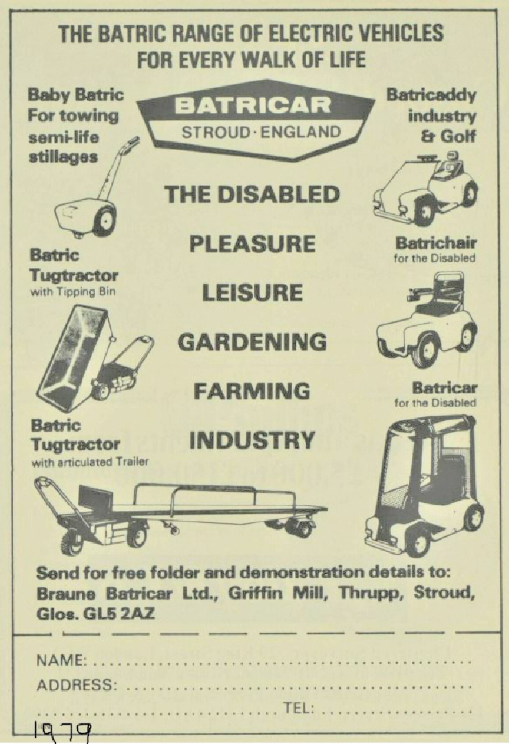 This page also refers to Batric, Batric Limited, Braune Batricar Ltd, and Braune of Stroud, all of  Griffin Mill, Thrupp, Stroud, Glos.