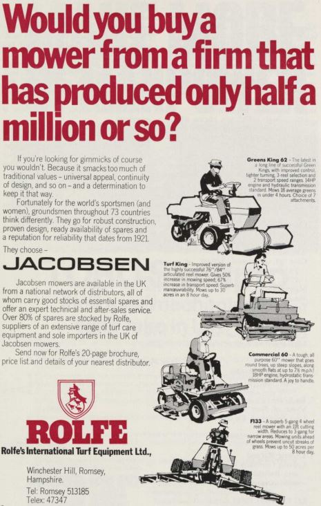 Rolfe International Turf Equipment, Jacobsen Greens King 62, Turf King, Commercial 60, F133 mowers, vintage advert