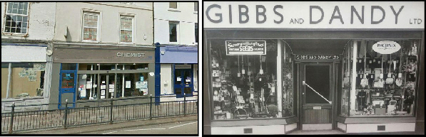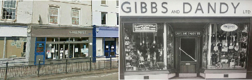 Image of the Gibbs & Dandy shop as it is now as a chemists on the left, long forgotten are the window displays of Gibbs & Dandy as in 1953 on the right.